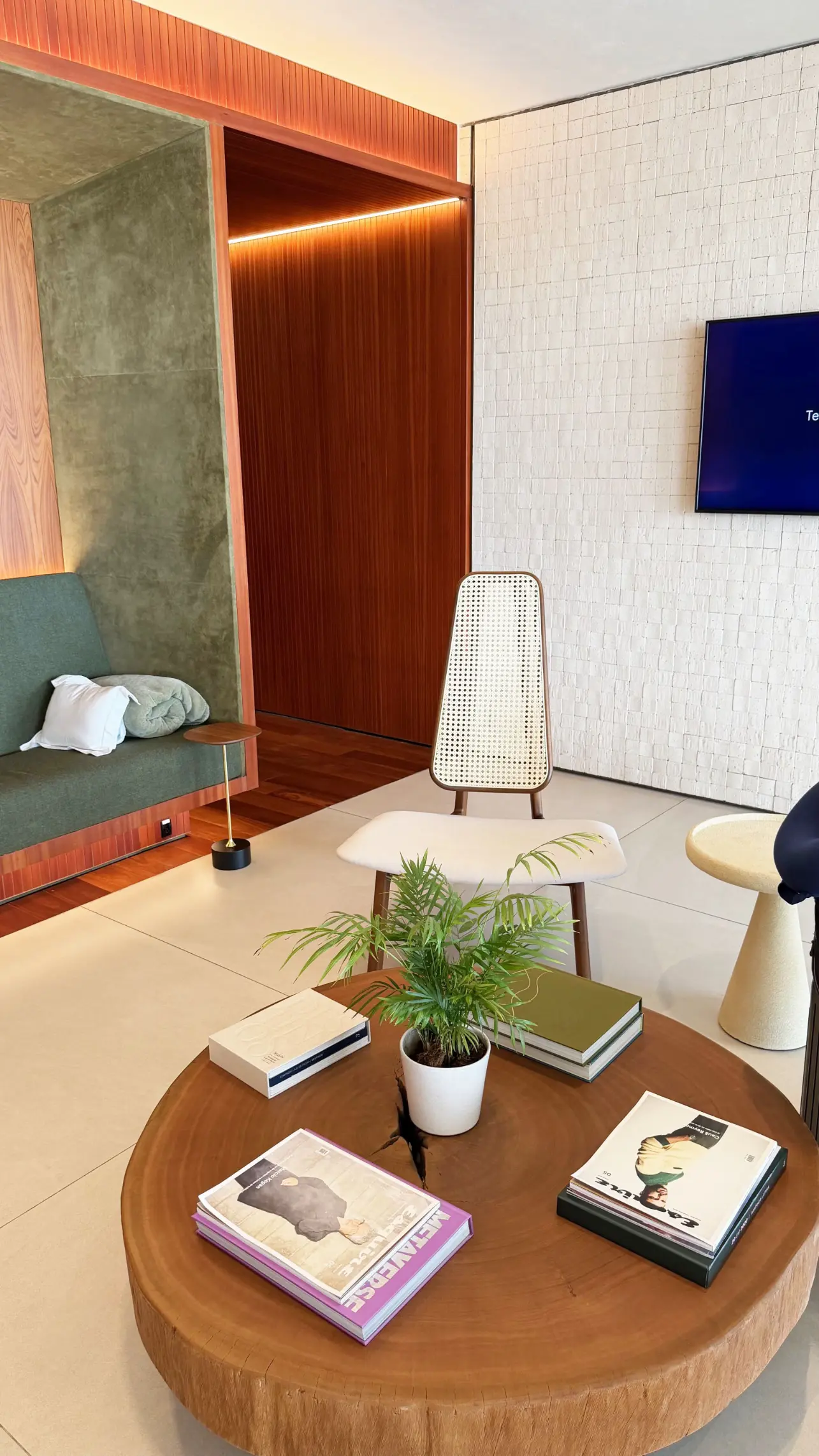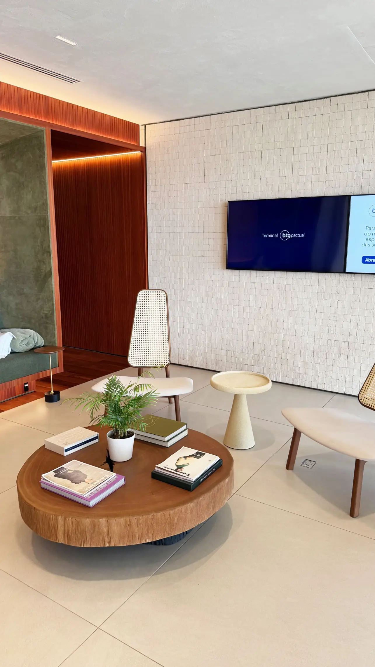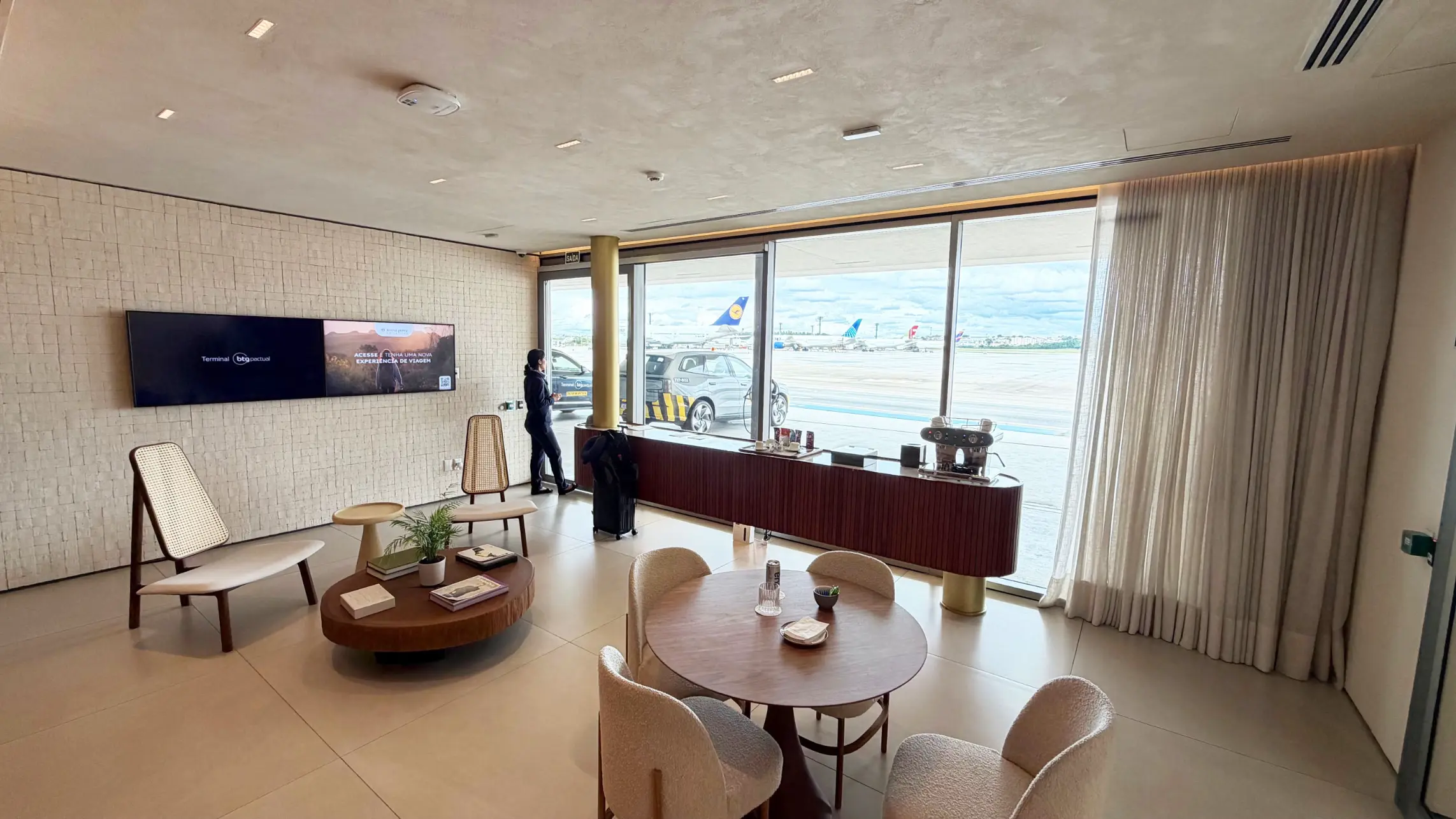 Esse primeiro lounge funciona como um espaço de conexão dentro da experiência do Terminal BTG Pactual em Guarulhos, oferecendo um ambiente tranquilo para aguardar enquanto toda a parte operacional acontece nos bastidores. No local são servidas bebidas e é possível acompanhar a movimentação das aeronaves pela área envidraçada.