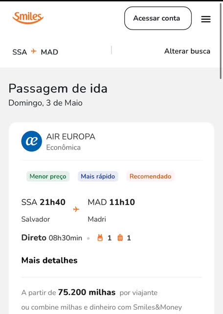 Apenas 75.200 milhas trecho. Emissão via Smiles voando Air Europa.