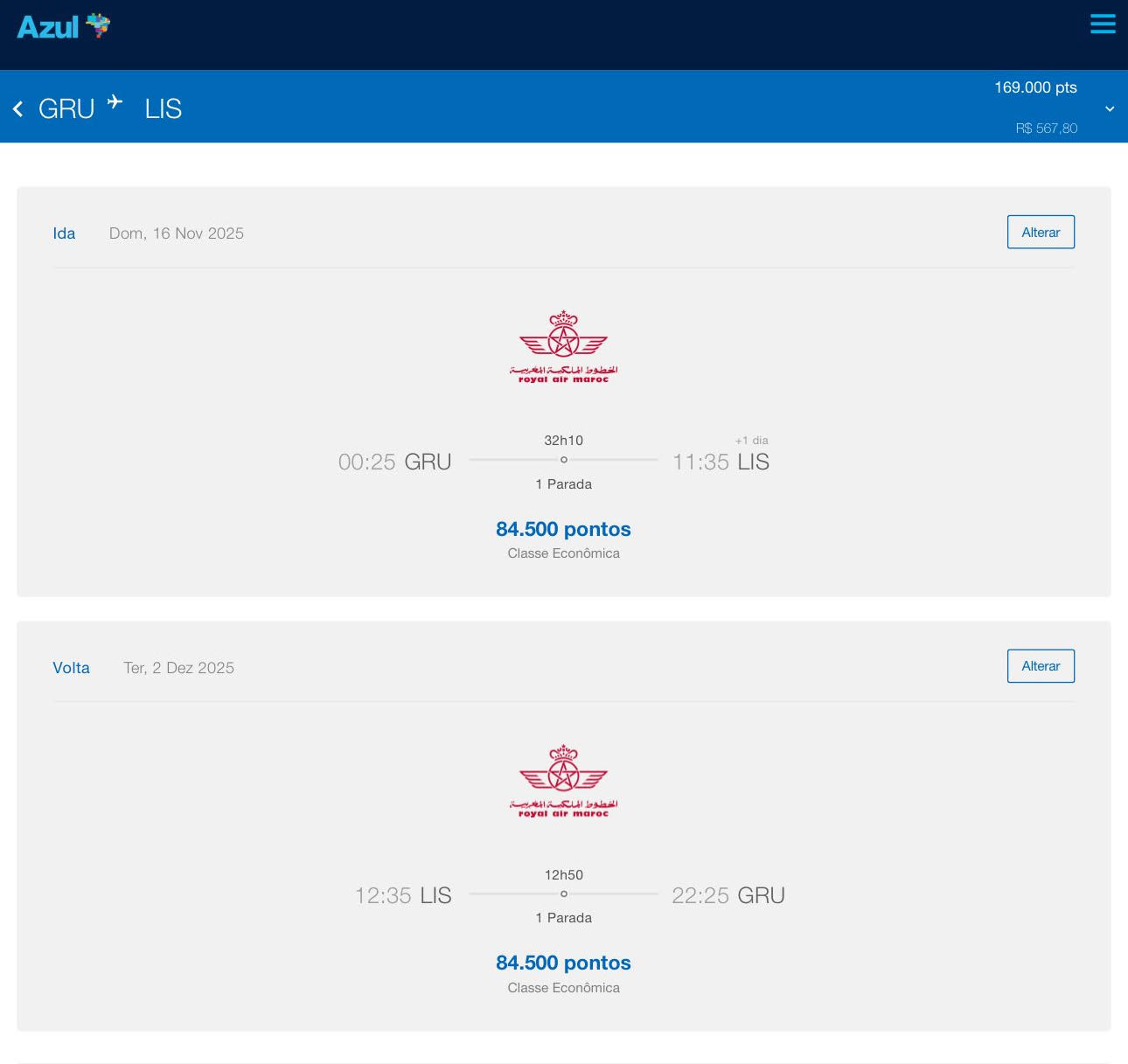 Apenas 84.500 pontos trecho. Emissão via Azul Pelo Mundo voando Royal Air Maroc.