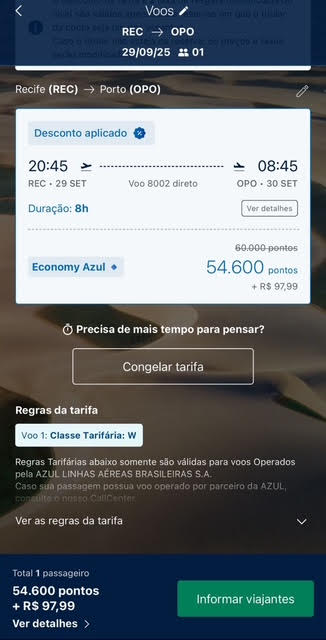 Apenas 54.600 pontos trecho. Emissão via Azul Fidelidade voando Azul.