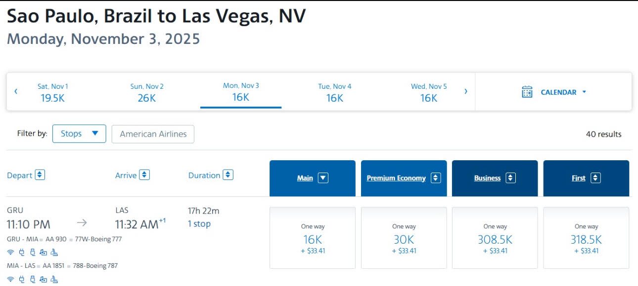 Apenas 16.000 milhas trecho. Emissão via AAdvantage voando American Airlines.