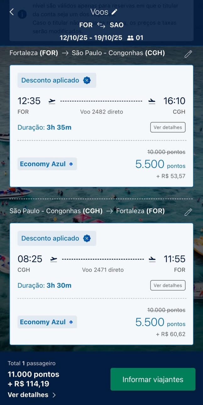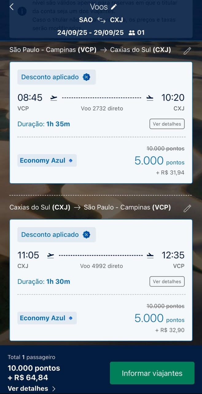 Apenas 5.500 pontos trecho. Emissão via Azul Fidelidade voando Azul.