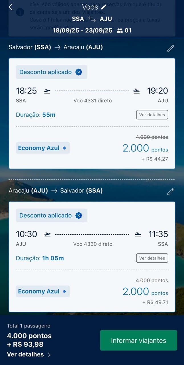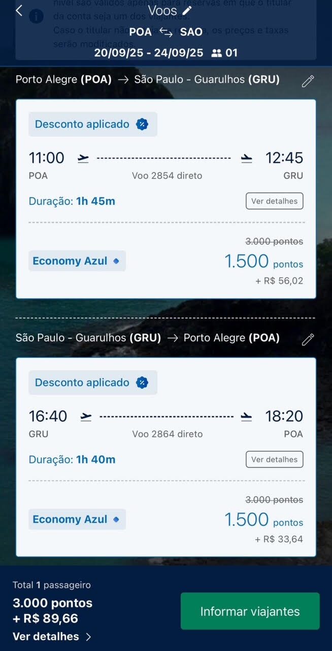 Apenas 1.500 pontos trecho. Emissão via Azul Fidelidade voando Azul.