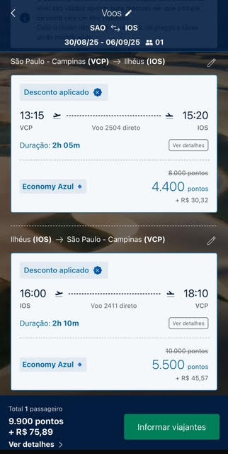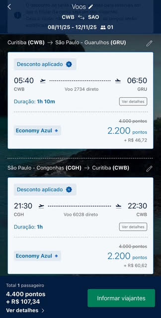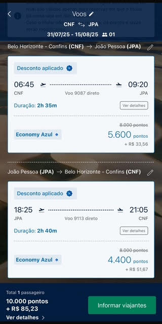 Apenas 4.400 pontos trecho. Emissão via Azul Fidelidade voando Azul.