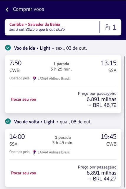 Apenas 6.891 milhas trecho. Emissão via LATAM Pass voando LATAM Airlines.