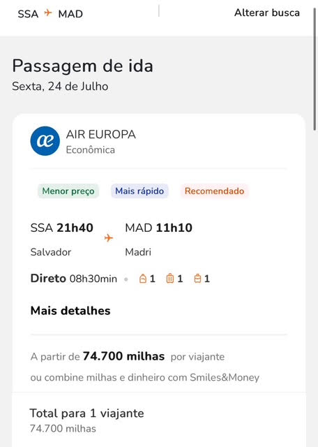 Apenas 74.700 pontos trecho. Emissão via Smiles voando Air Europa.