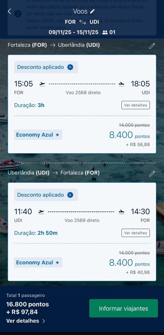 Apenas 8.400 pontos trecho. Emissão via Azul Fidelidade voando Azul.