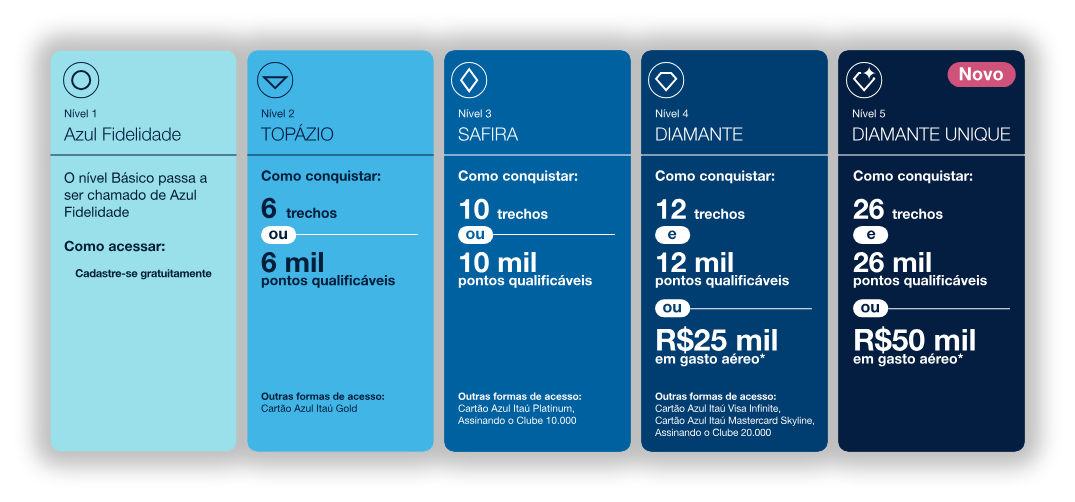 A nova categoria, chamada Diamante Unique, será concedida a clientes que alcançarem pelo menos 26 trechos voados e 26 mil pontos qualificáveis, ou que atingirem R$ 50 mil em gastos com a Azul ao longo do ano.