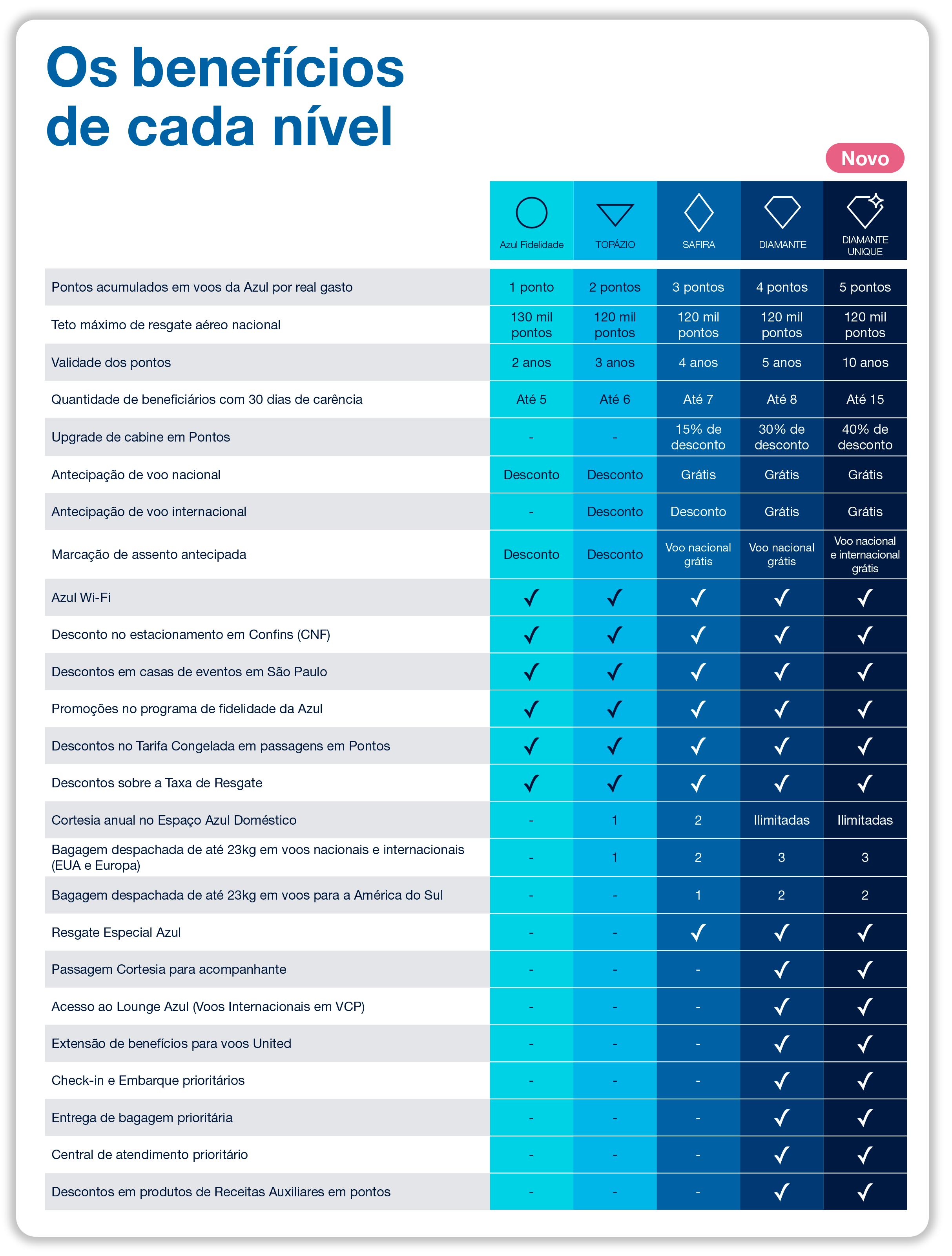 Marcação de assento antecipada: foi incluída a possibilidade em voos internacionais. Antes, o benefício era gratuito apenas em voos domésticos.