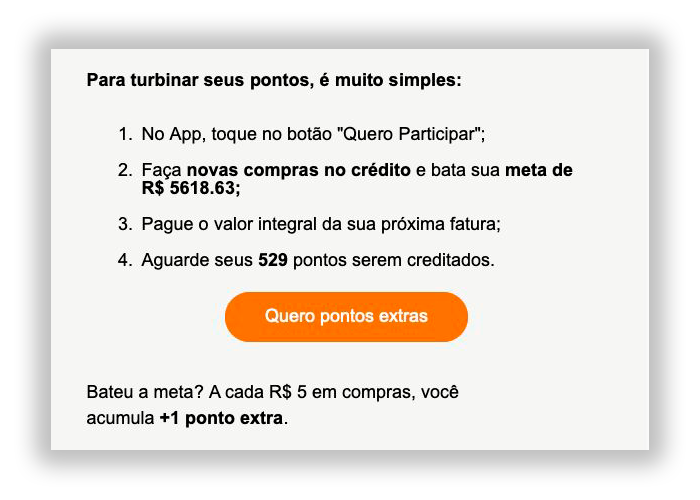 A meta complementar, que é ativada após atingir a meta inicial, melhora um pouco. Nesse estágio, você receberá 1 ponto a cada R$ 5 gastos.
