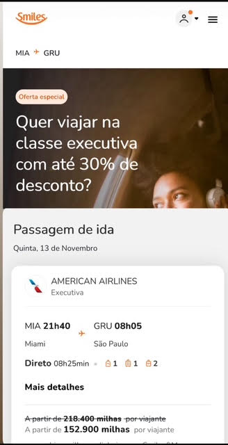 Apenas 152.900 milhas trecho. Emissão via Smiles voando American Airlines.