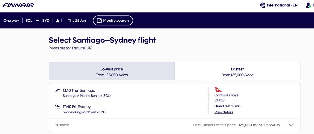 Apenas 125.000 milhas trecho. Emissão via Finnair Plus voando Qantas.