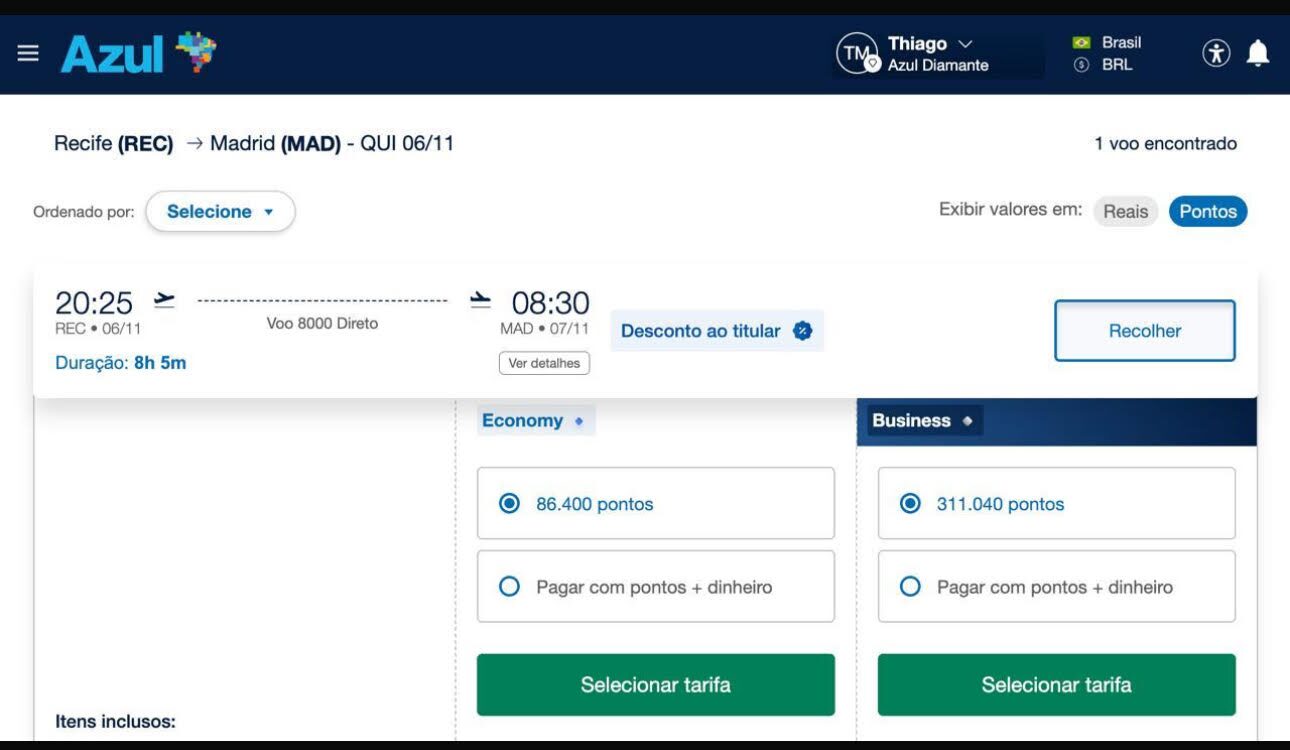 Apenas 311.040 pontos trecho. Emissão via Azul Fidelidade voando Azul.