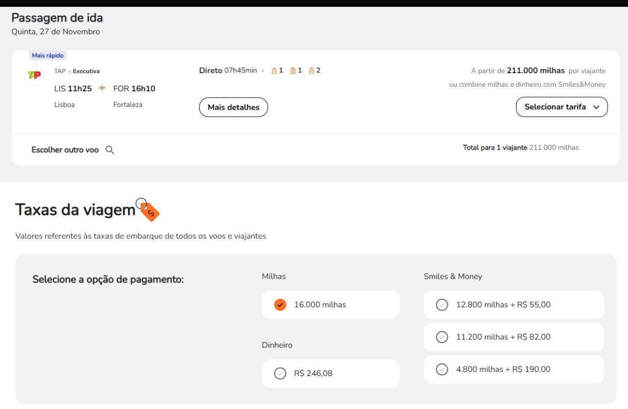 Apenas 211.000 milhas trecho. Emissão via Smiles voando TAP.