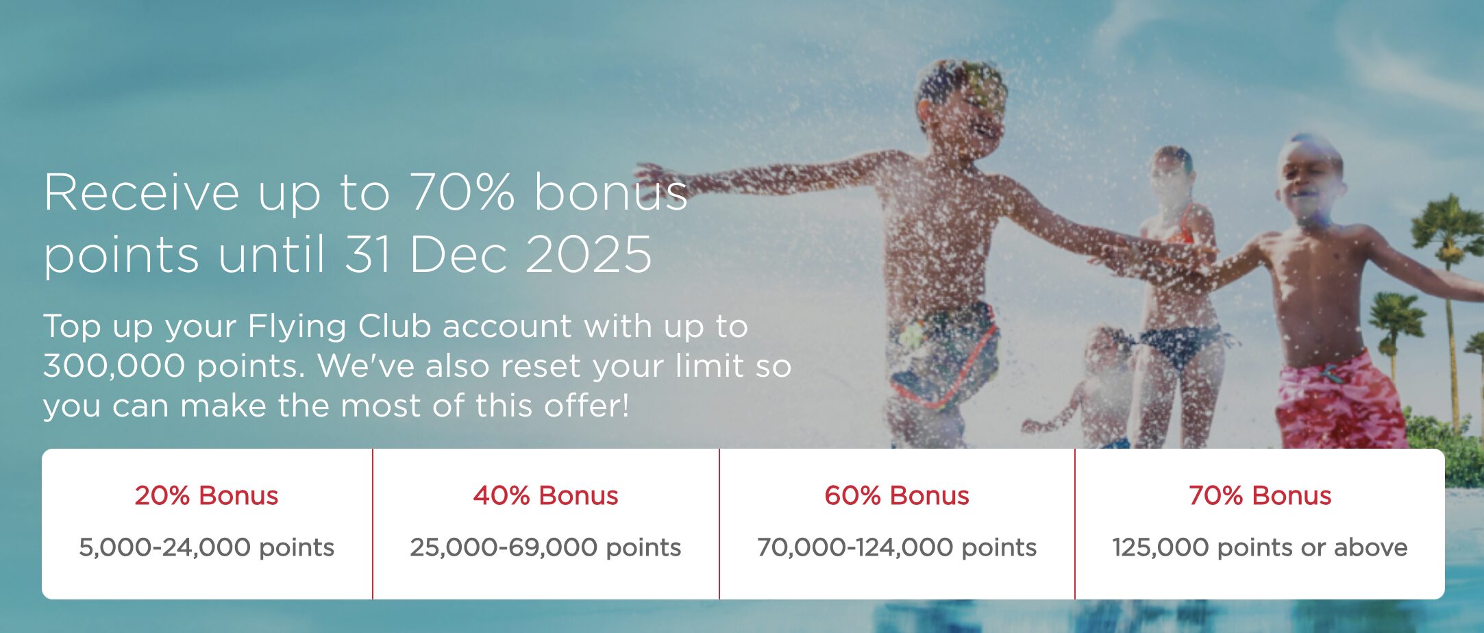 Flying Club, programa de fidelidade da companhia Virgin Atlantic, está com uma campanha oferecendo até 70% de bônus na compra de pontos até o dia 31/12.