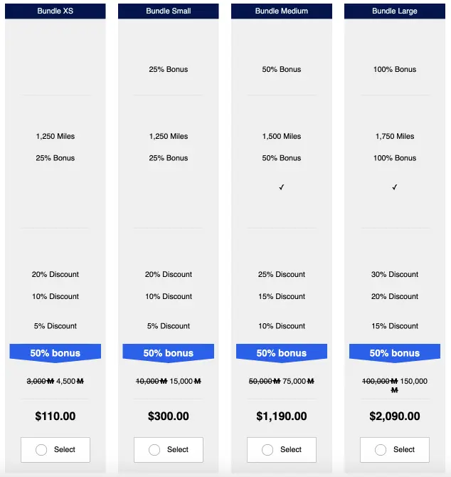 • 3.000 pontos – 50% de bônus – 24,44 dólares o milheiro