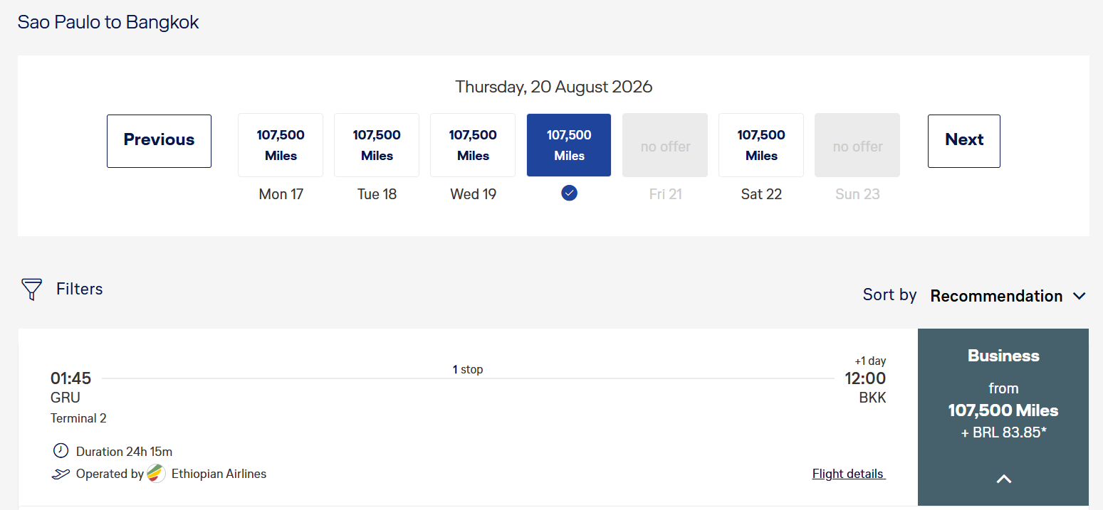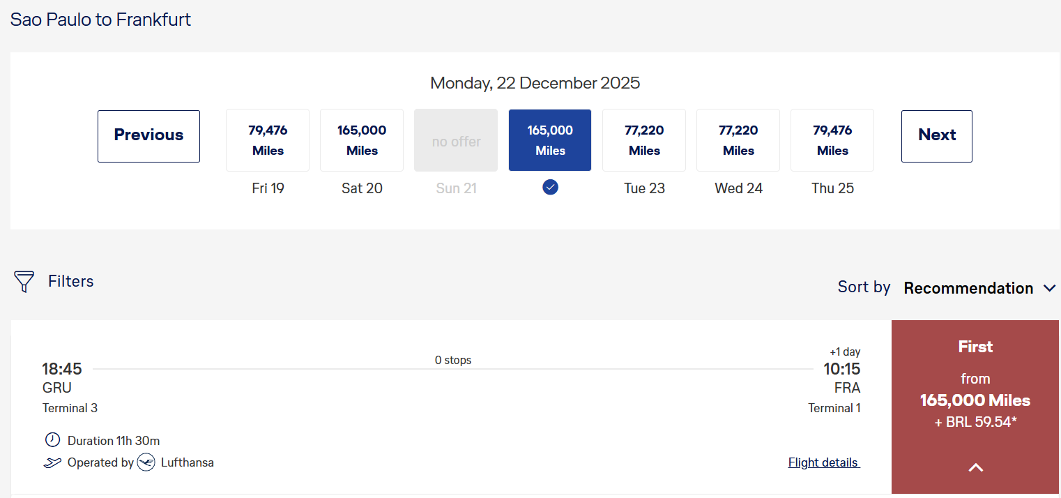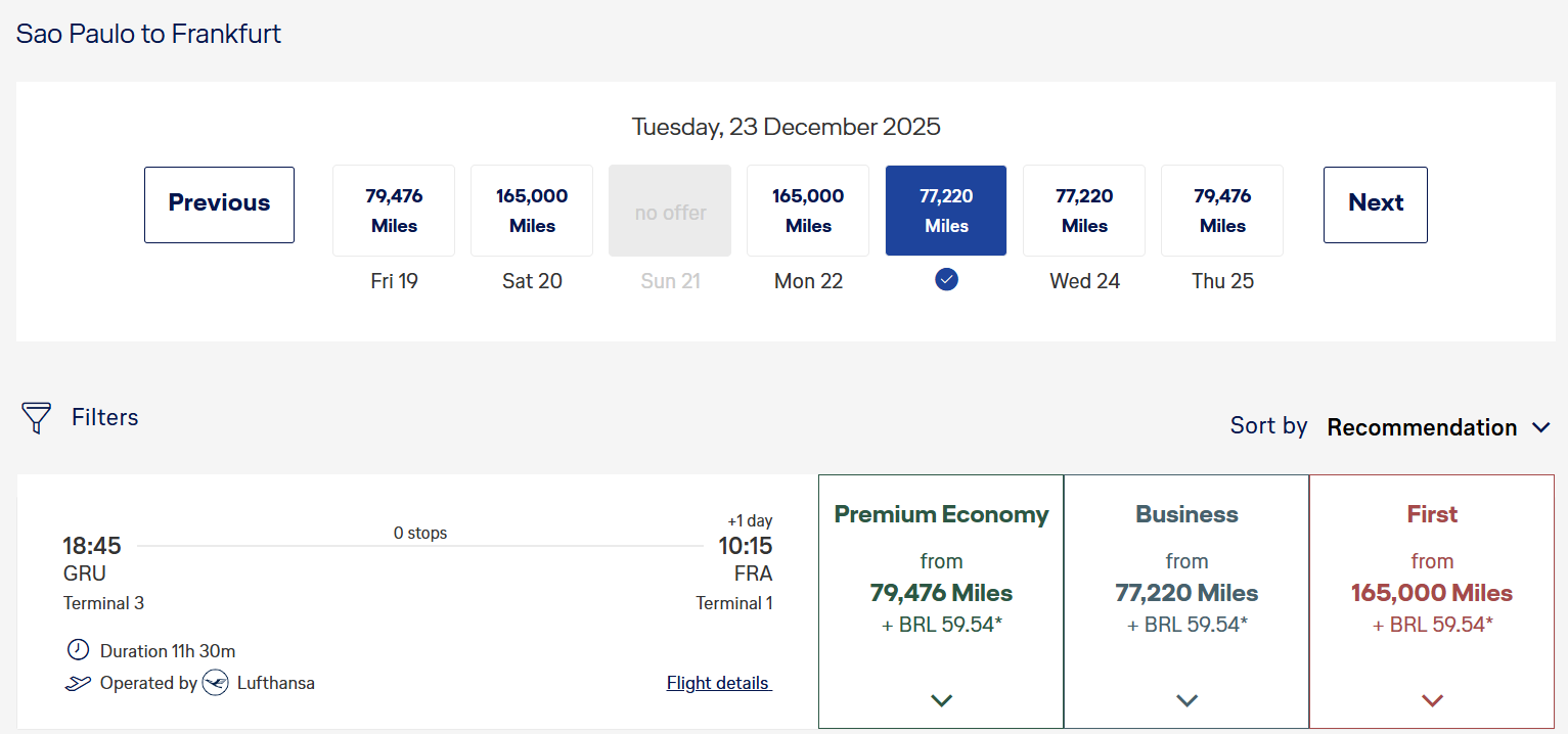 O diferencial é a disponibilidade, principalmente voando Lufthansa. Nos programas parceiros temos datas bem pontuais e, aqui no próprio programa, temos muitas oportunidades. Ainda mais se falarmos de primeira classe!