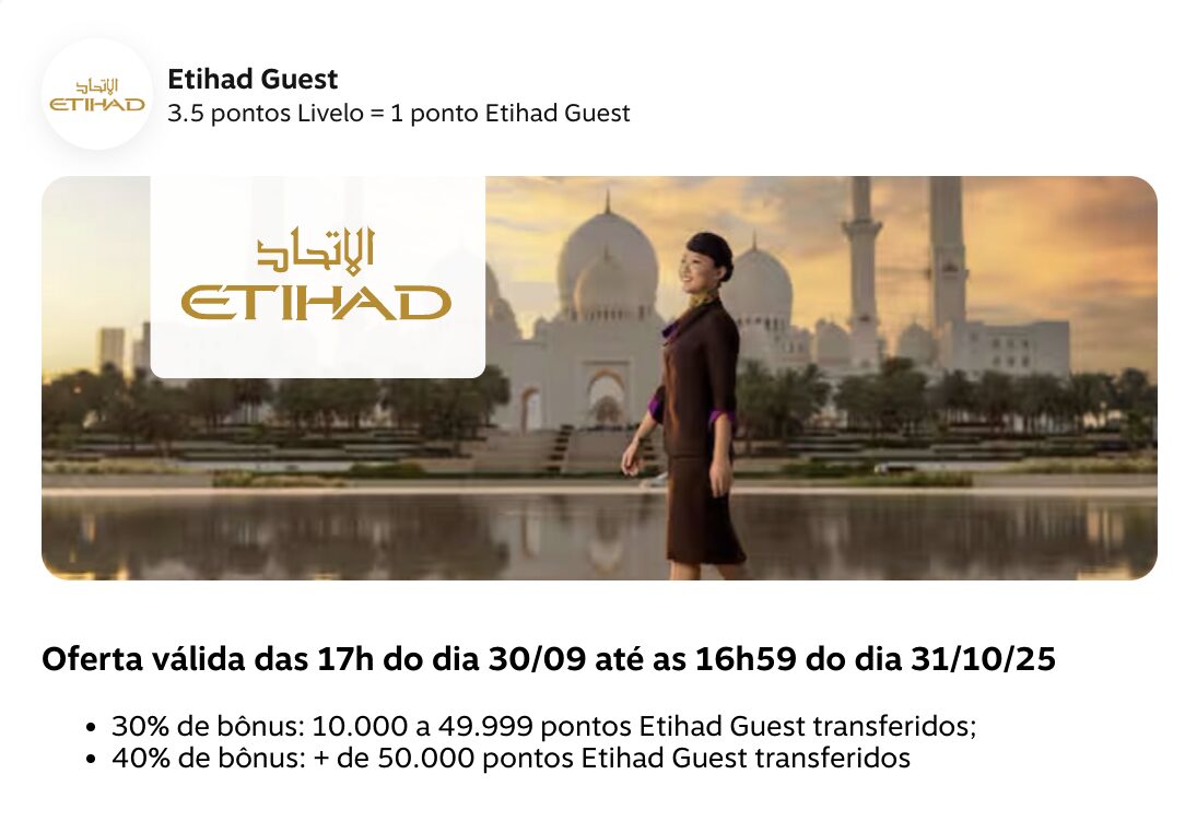 O Etihad Guest, programa de fidelidade da Etihad, está oferecendo aos seus clientes até 40% de bônus nas transferências de pontos do programa Livelo.
