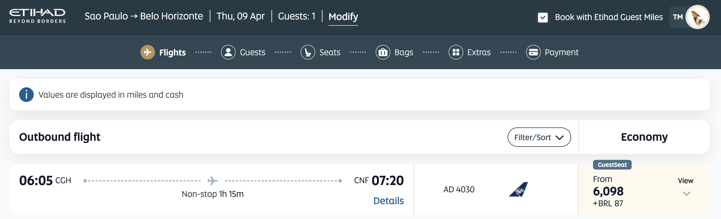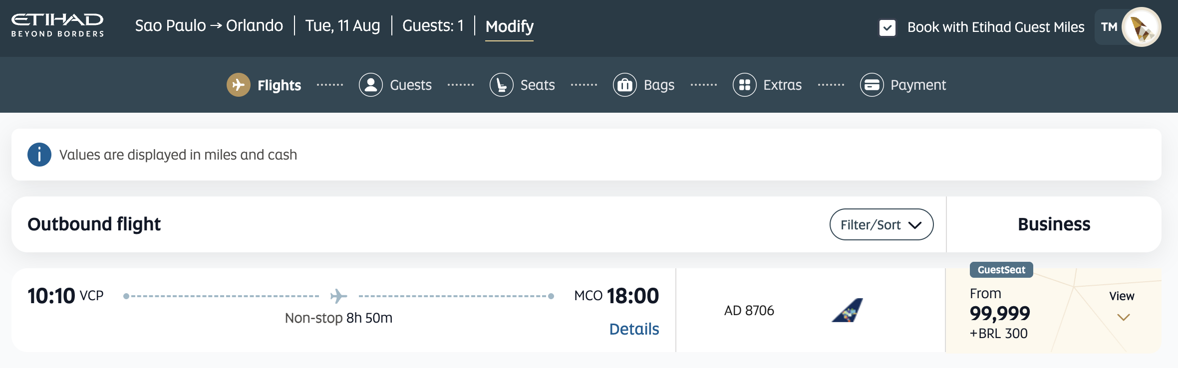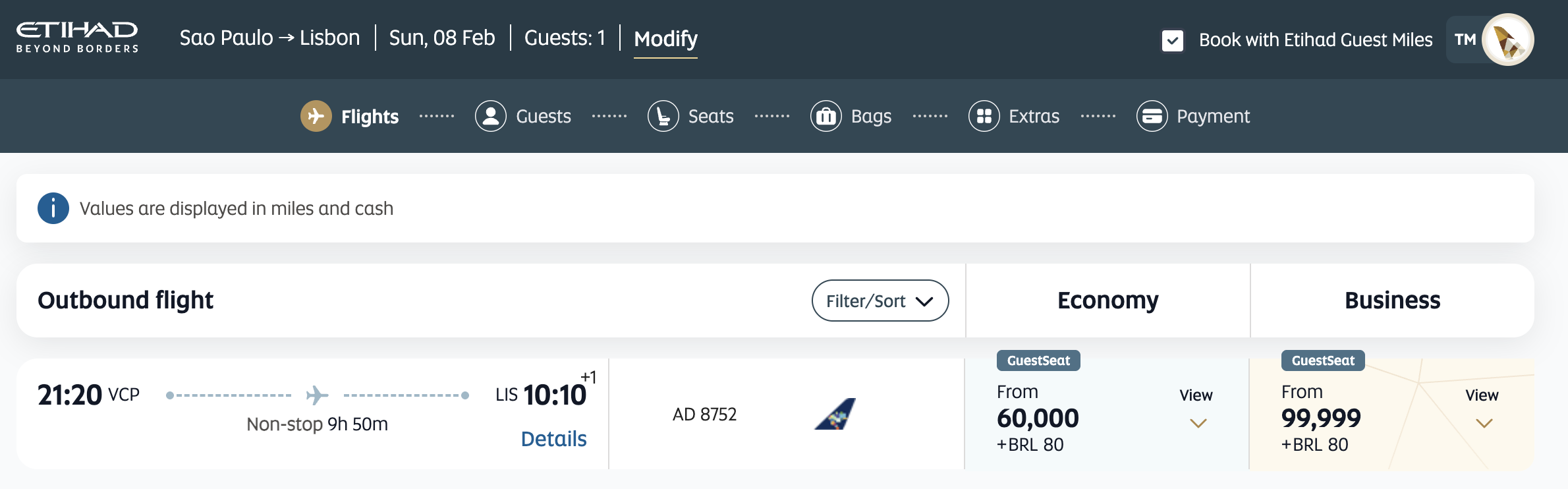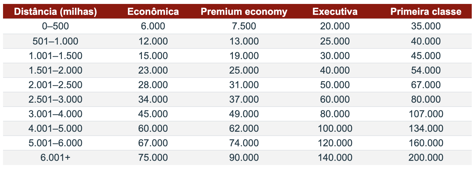O programa Etihad Guest a tabela fixa por distância para precificar seus voos em milhas, de acordo com a companhia aérea (Etihad ou parceiros) e distância.
