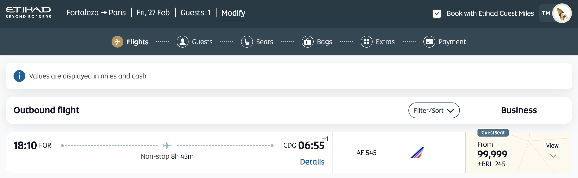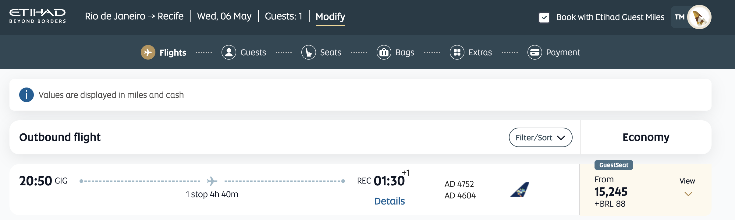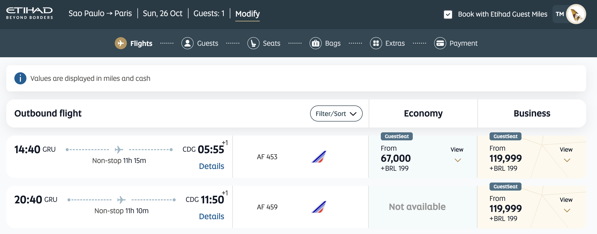 O programa Etihad Guest a tabela fixa por distância para precificar seus voos em milhas, de acordo com a companhia aérea (Etihad ou parceiros) e distância.
