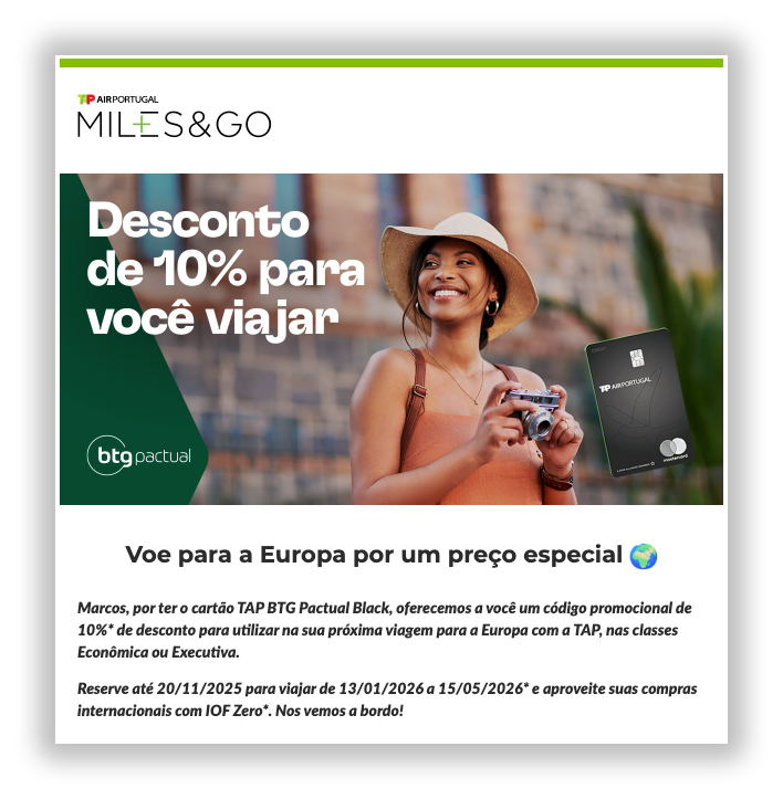 Titulares do cartão de crédito BTG TAP Mastercard Black estão recebendo um e-mail com um código promocional de 10% de desconto para utilizar em uma reserva TAP até 20 de novembro de 2025. A promoção é válida para voos com destino à Europa, nas classes Econômica ou Executiva, para viagens realizadas entre 13 de janeiro de 2026 e 15 de junho de 2026.