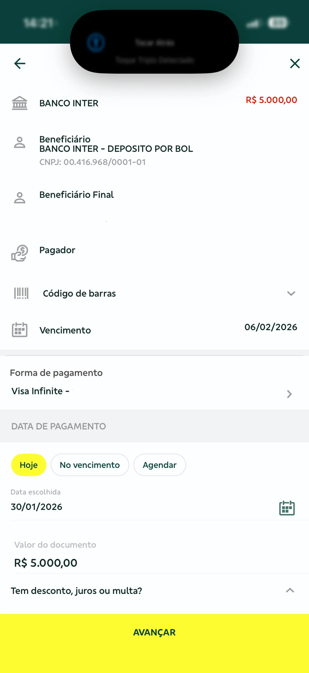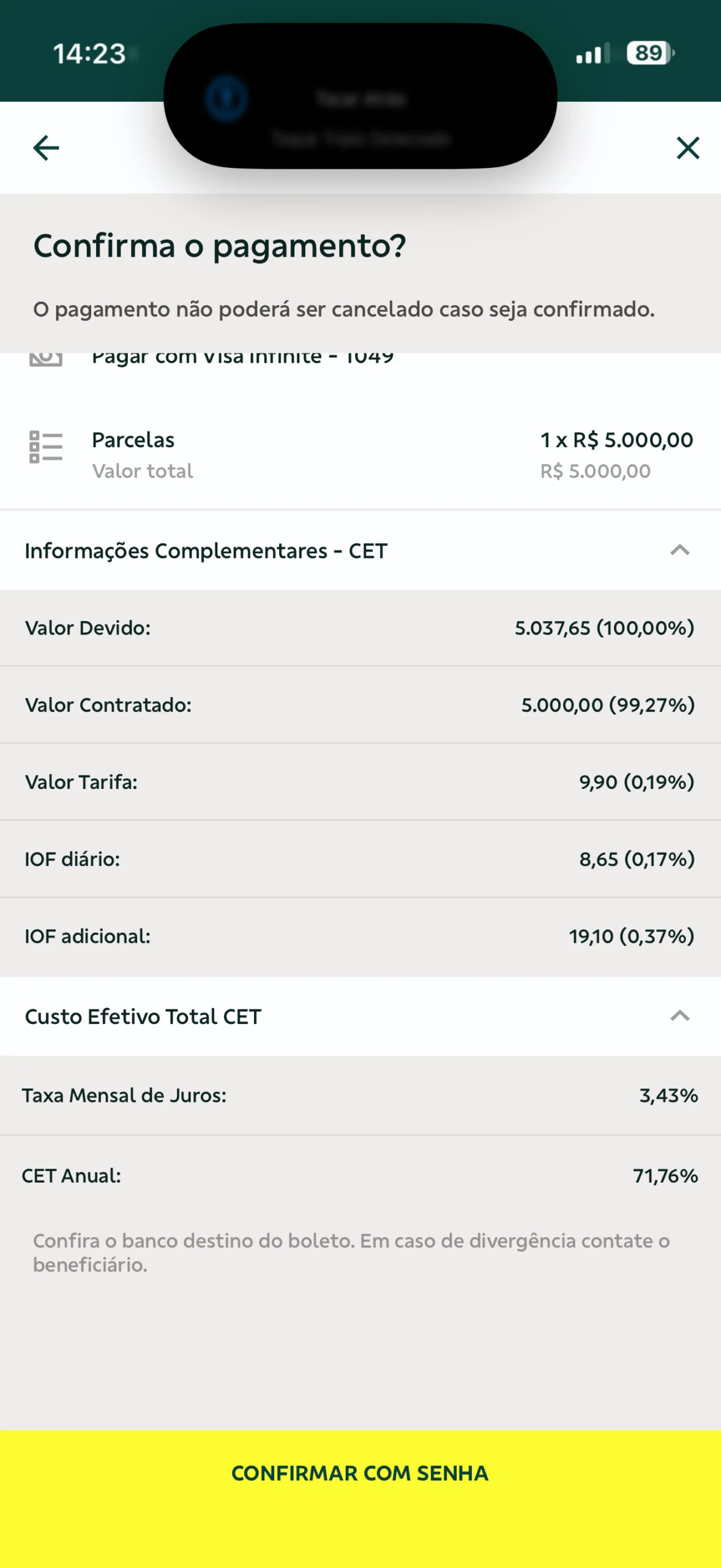 A resposta depende de alguns fatores. O custo final da operação varia conforme a data de pagamento do boleto, a data de vencimento da fatura e o momento em que a fatura é quitada. Por isso, para entender o custo real da transação, é fundamental realizar uma simulação diretamente no aplicativo.