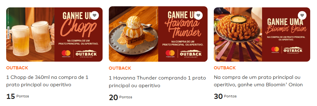 Mastercard Surpreenda, programa de pontos da Mastercard, está oferecendo aperitivos e sobremesas grátis no Outback Steakhouse em troca de pontos Surpreenda.