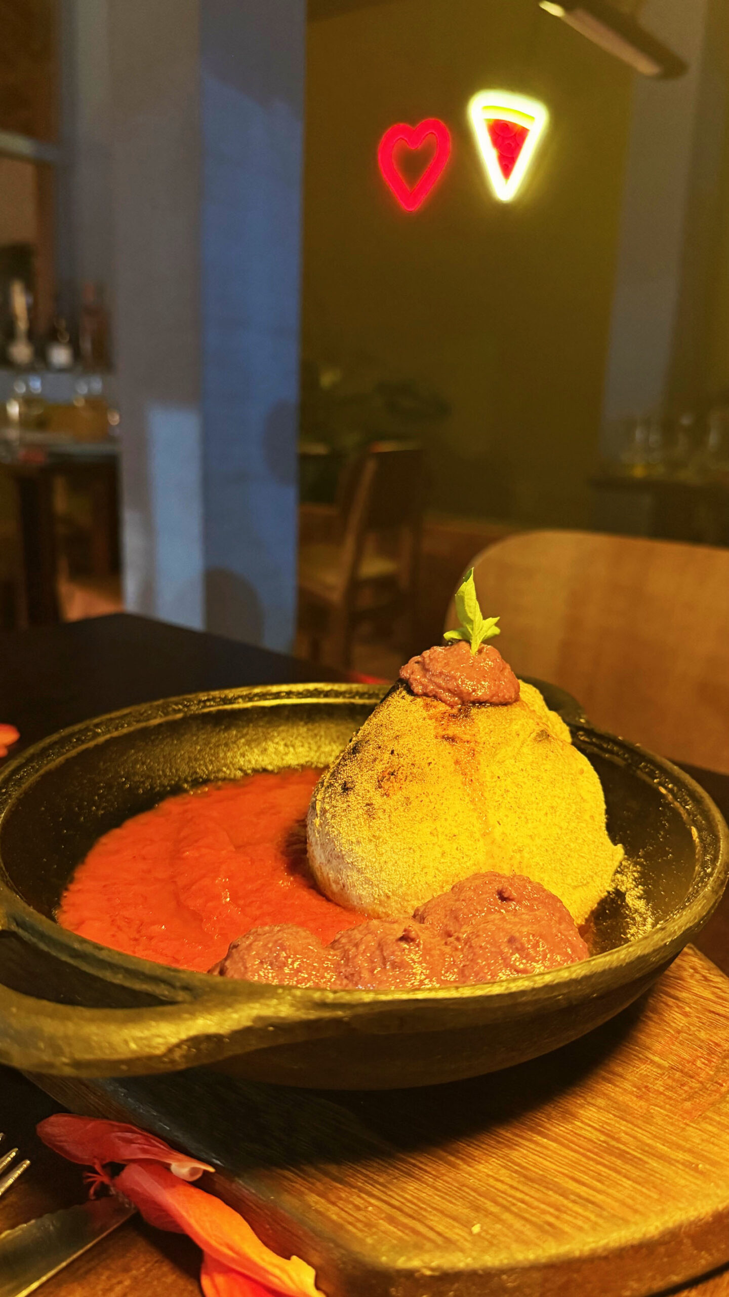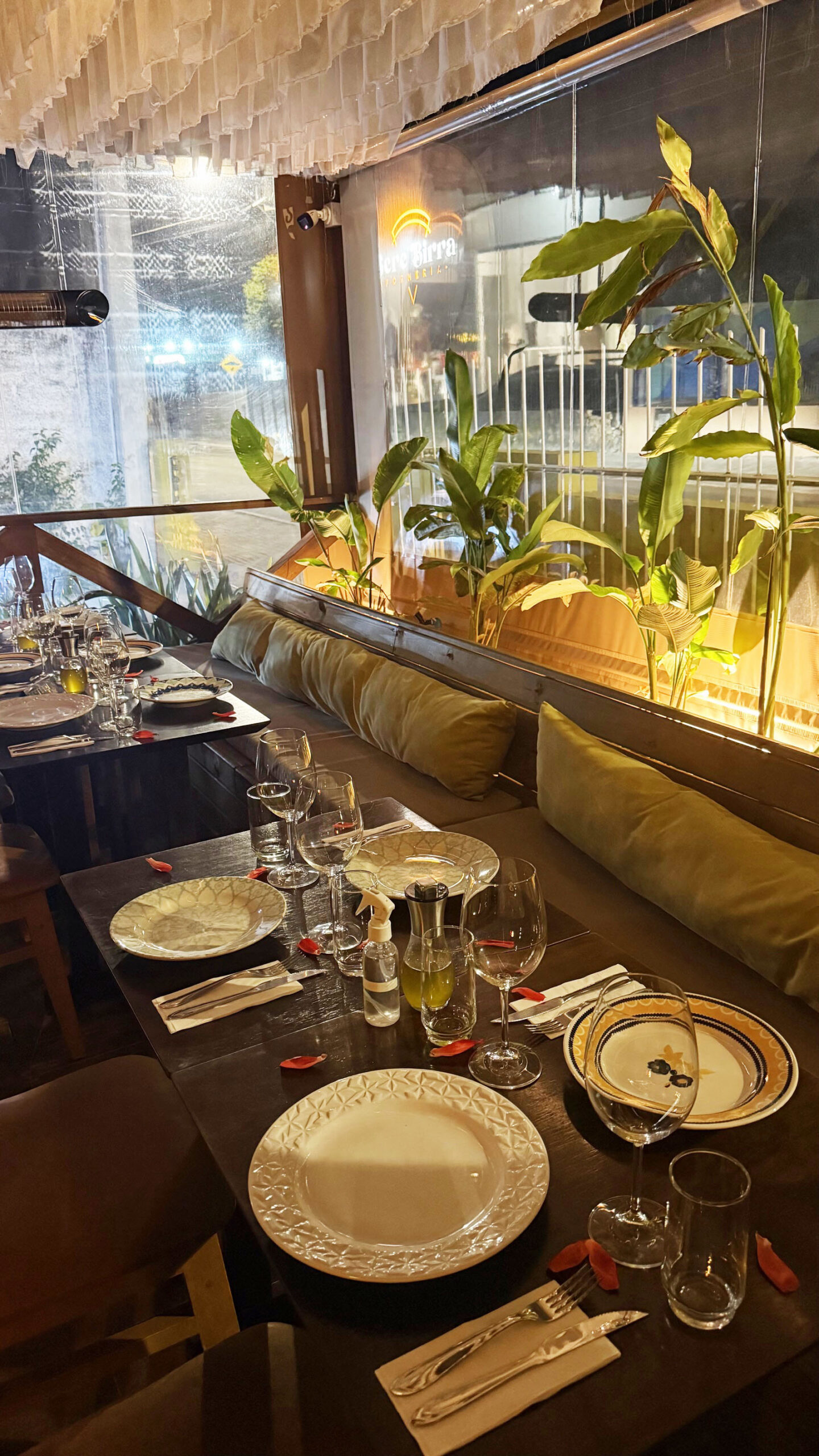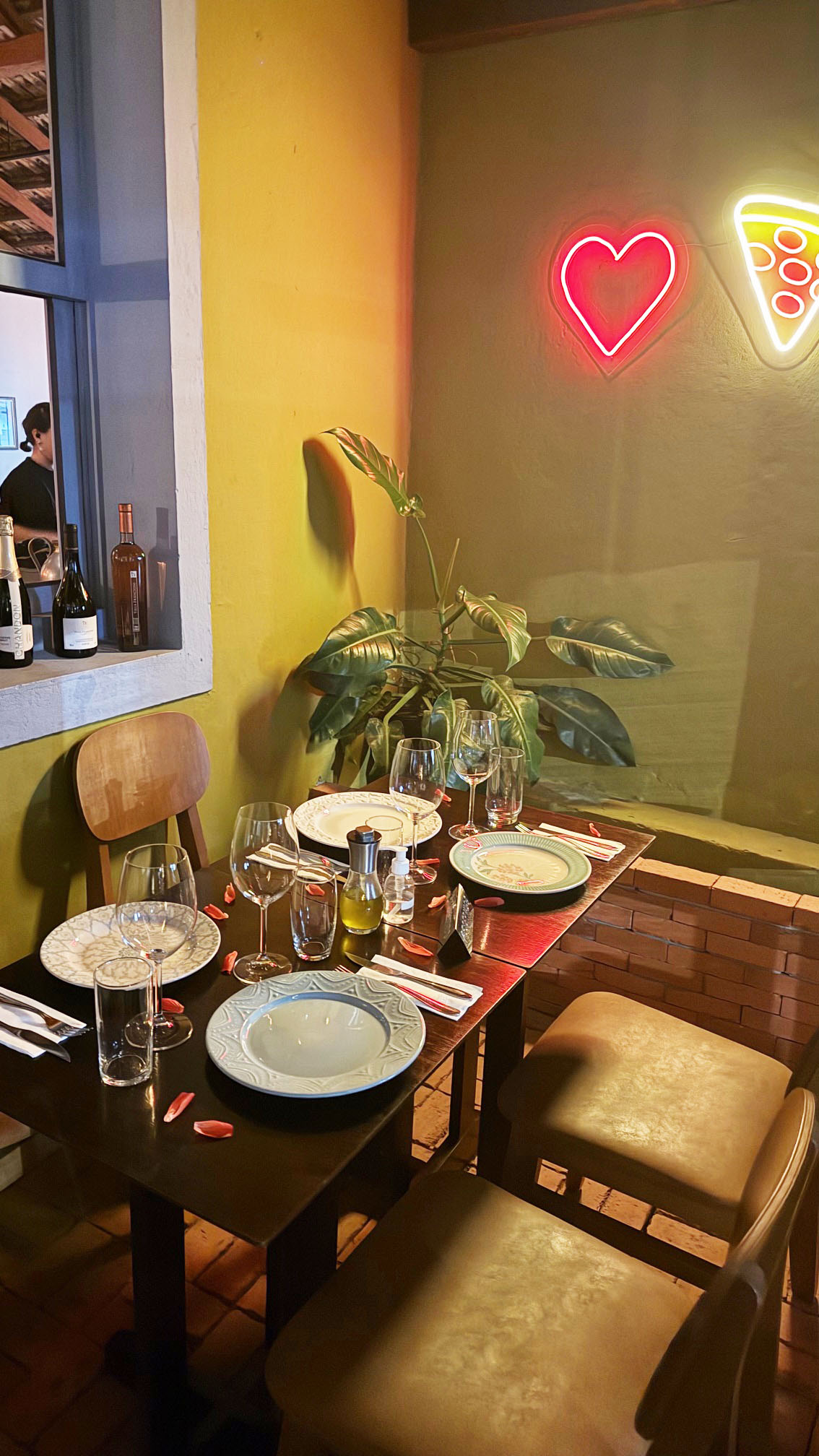 O restaurante oferece um ambiente aconchegante e romântico, perfeito para jantares especiais. Com decoração charmosa, luz baixa, pétalas sobre a mesa e detalhes em neon, o espaço mistura o rústico com o moderno. Plantas, louças elegantes e atendimento cuidadoso completam a experiência. No cardápio, destaque para as pizzas artesanais, generosas e cheias de sabor, servidas em um clima intimista que transforma qualquer noite em um momento memorável.