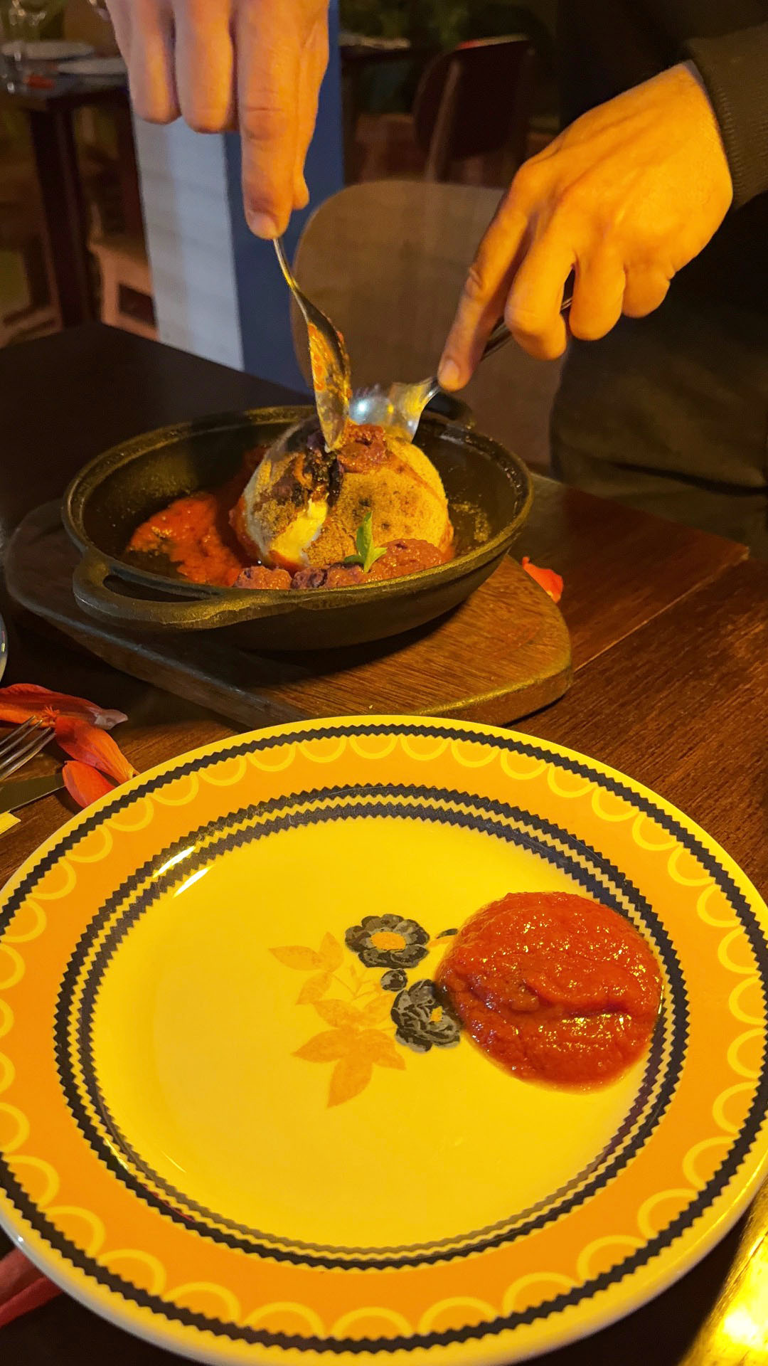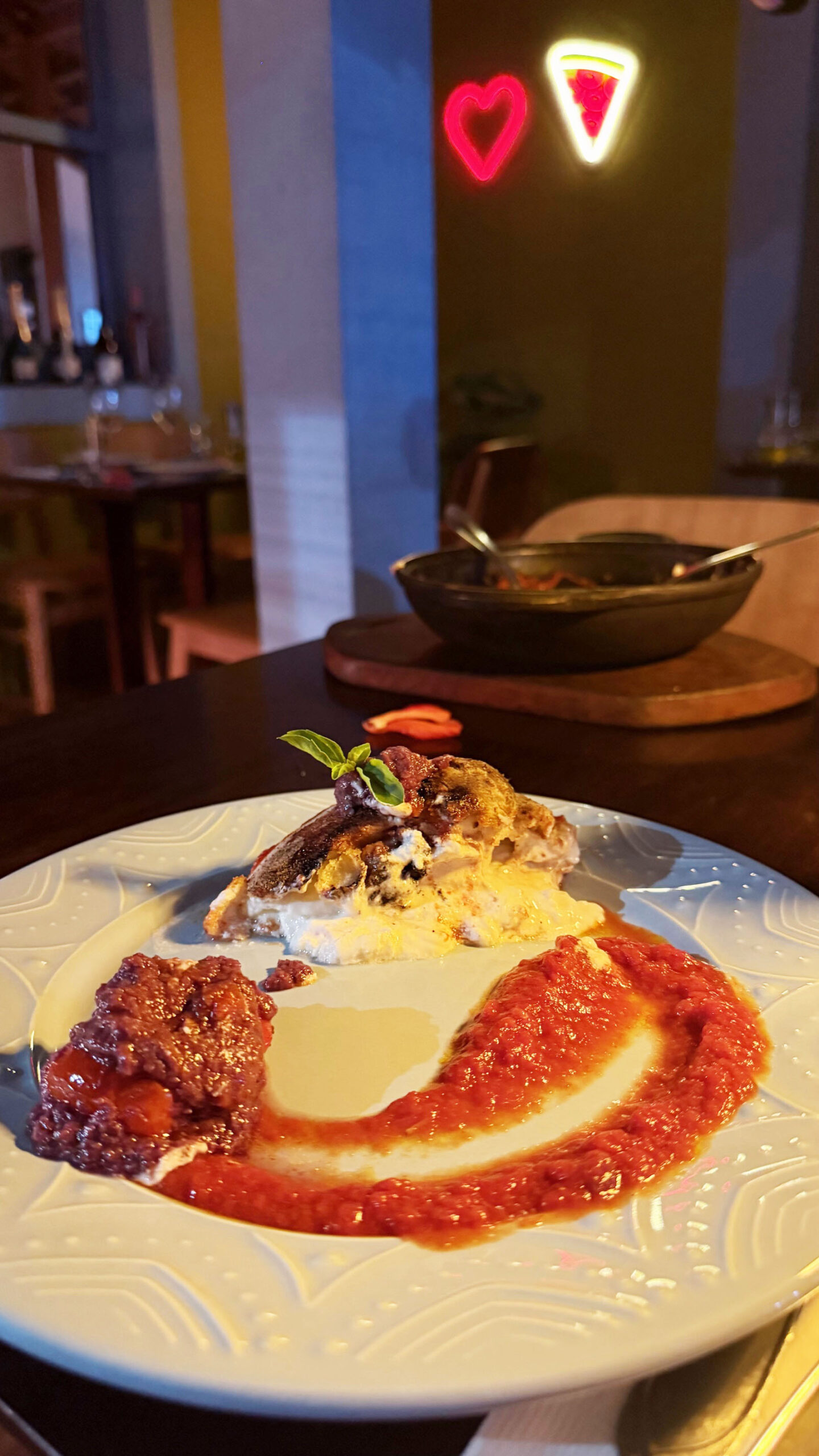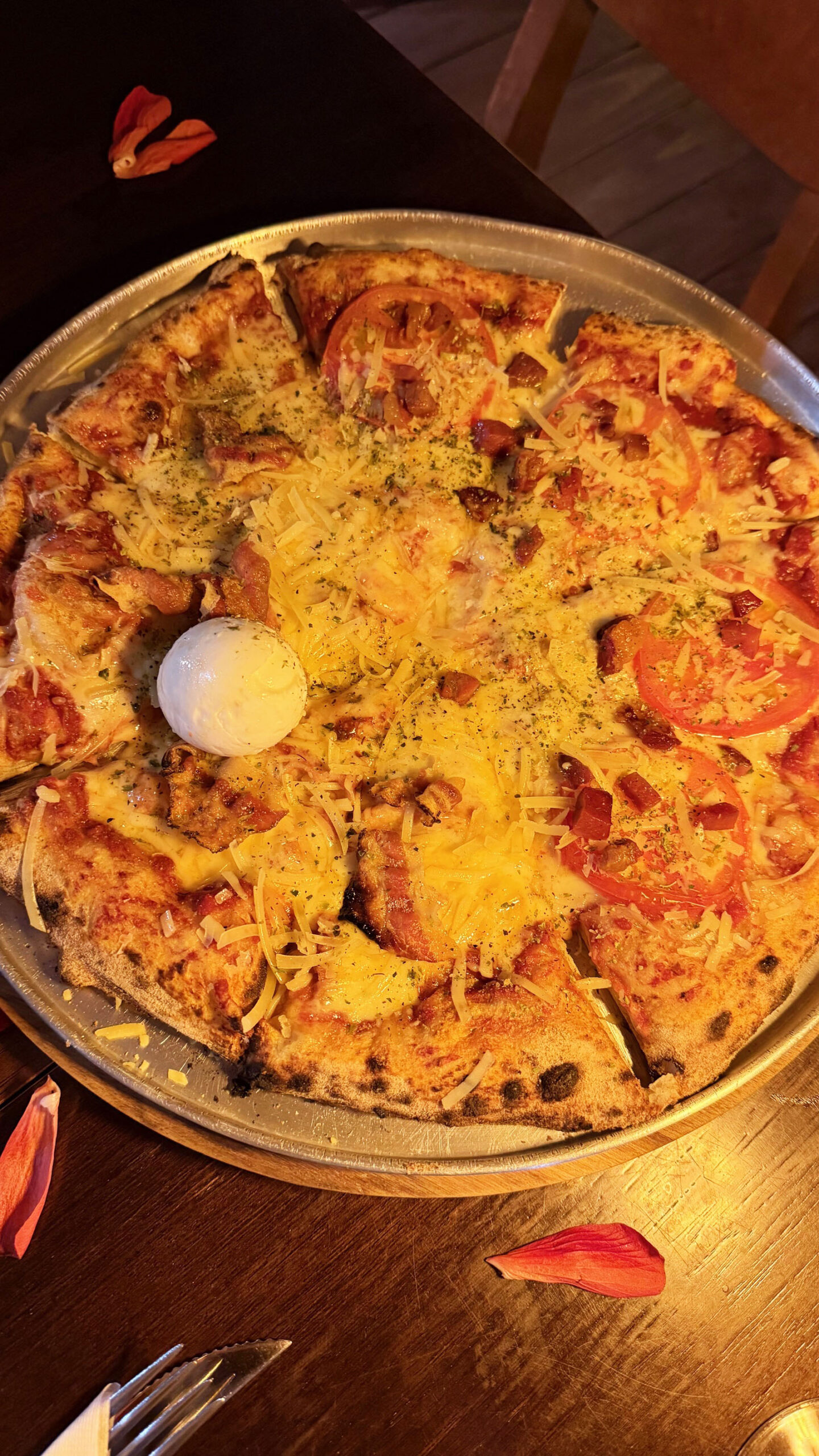 Fugindo das versões mais tradicionais, essa releitura trazia uma base envolvente de molho de tomate, que conferia acidez equilibrada e profundidade ao prato. Sobre ela, camadas generosas de muçarela derretida garantiam cremosidade e riqueza, enquanto pedaços crocantes e intensamente saborosos de pancetta adicionavam um toque defumado e salgado, elevando ainda mais a complexidade do conjunto.