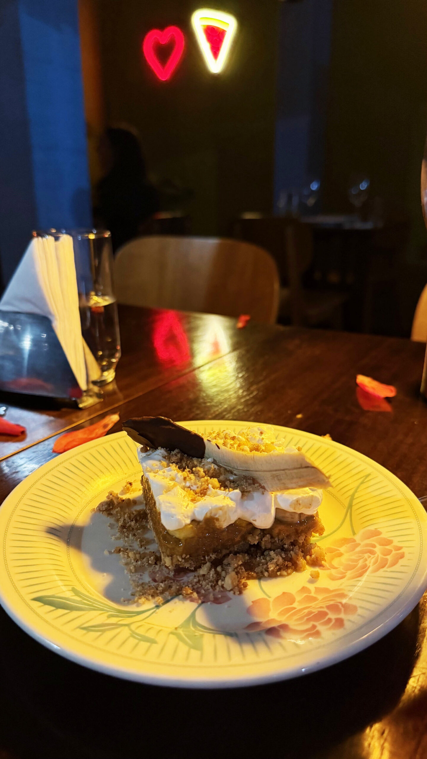 Para finalizar, experimentei uma receita exclusiva da casa: torta banoffi – uma sobremesa que unia equilíbrio e generosidade nos sabores. Começava com uma base crocante de biscoito amanteigado levemente salgado, que contrastava com o doce de leite artesanal cremoso e intenso. Sobre ele, rodelas de banana madura traziam frescor, enquanto o chantilly leve e aerado, feito na casa, suavizava o conjunto juntamente com uma farofa crocante, que adicionava textura e um toque amanteigado extra. O destaque ficava para a apresentação: no topo, uma banana crispy, e com metade coberta por chocolate, que dava um toque especial.