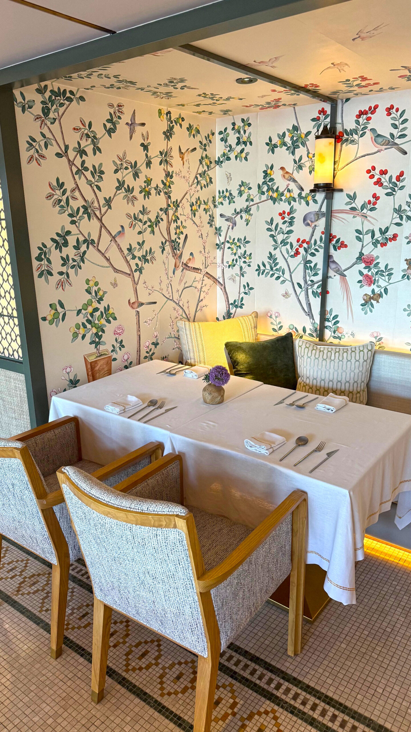 Ao entrar, os salões internos revelam uma ambientação sofisticada e acolhedora, com paredes elegantemente decoradas com painéis florais orientais, estofados em tons neutros, iluminação suave e uma combinação de madeira clara com toques dourados.