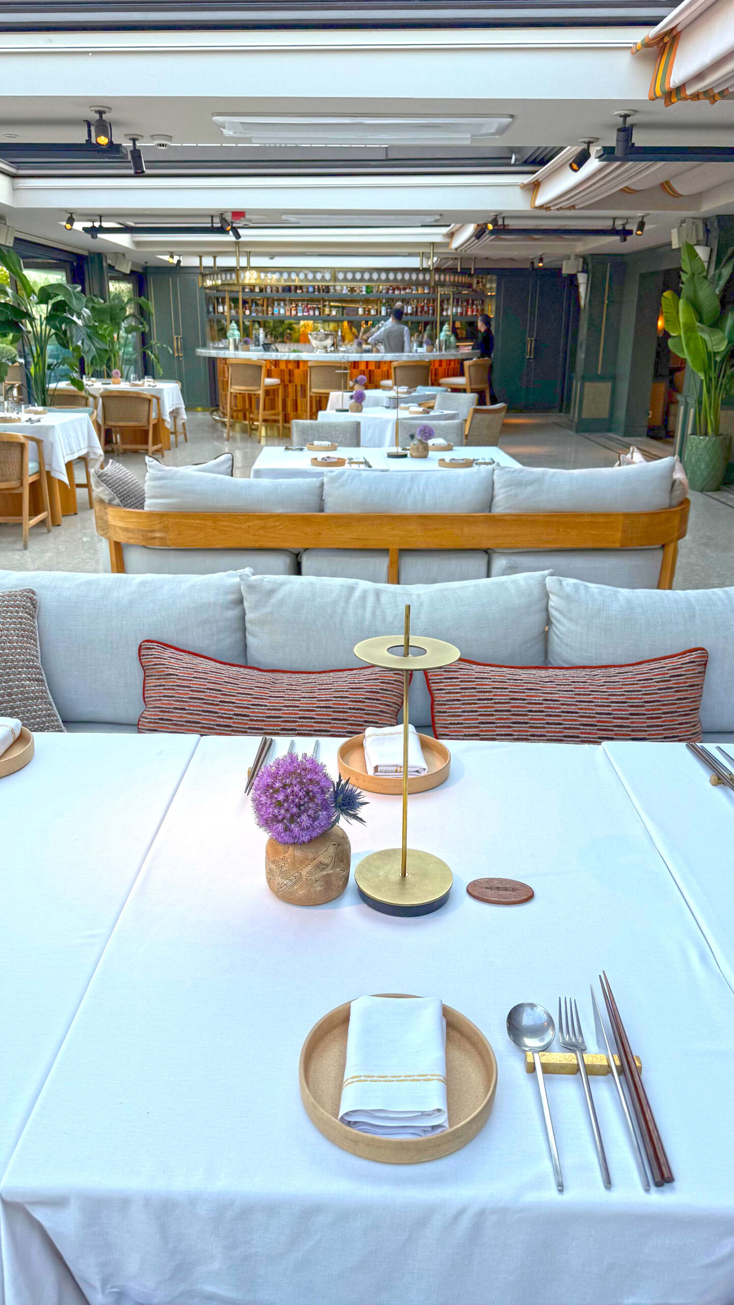 Mais ao fundo, o salão principal oferece uma vista ampla para o bar e para as mesas que se estendem até a área externa. Aqui, o destaque vai para os sofás baixos e mesas de madeira clara, perfeitamente dispostas para privilegiar o conforto sem abrir mão da sofisticação.