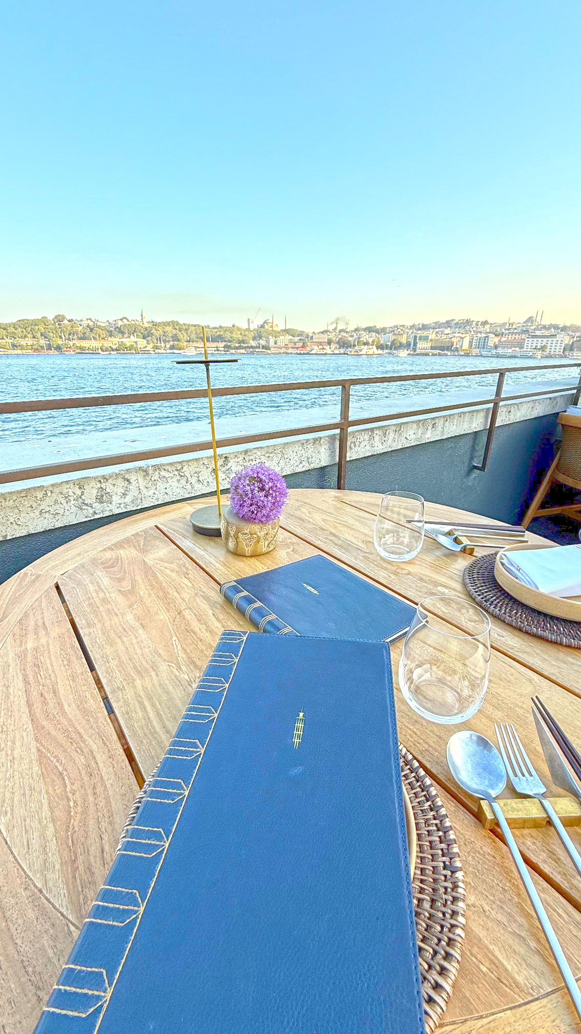 Escolhi uma mesa do lado de fora, no terraço, onde a vista para o Estreito de Bósforo e para as deslumbrantes e majestosas Mesquita Azul e Hagia Sophia, que encantam com sua imponência, beleza arquitetônica e profunda carga histórica, tornando-se ícones atemporais de Istambul.
