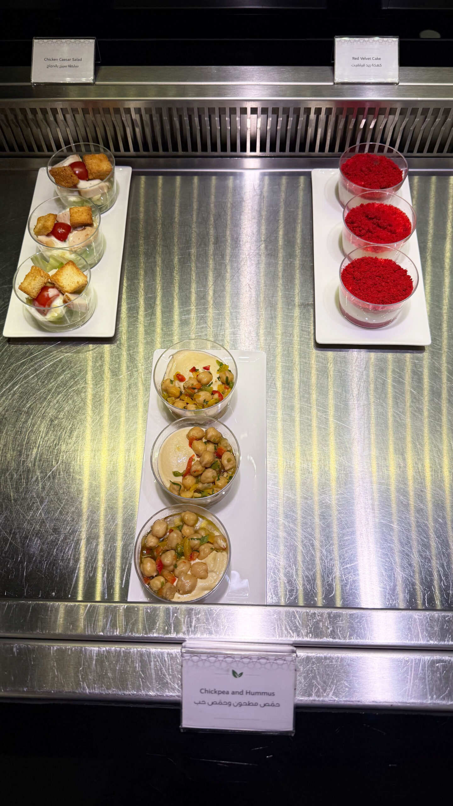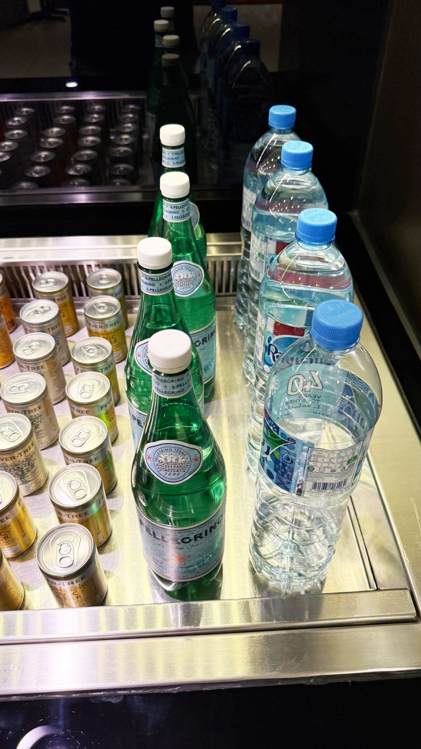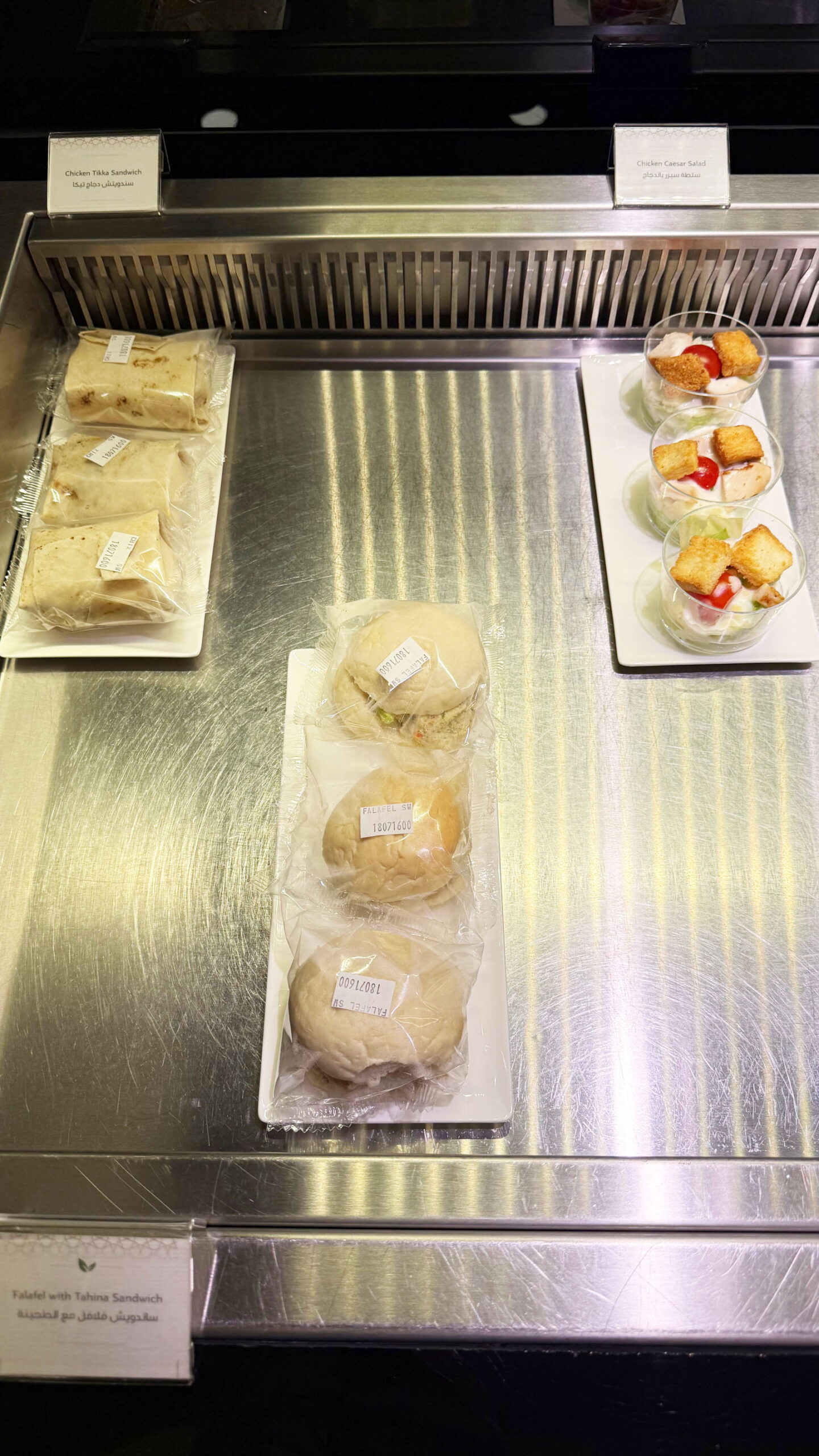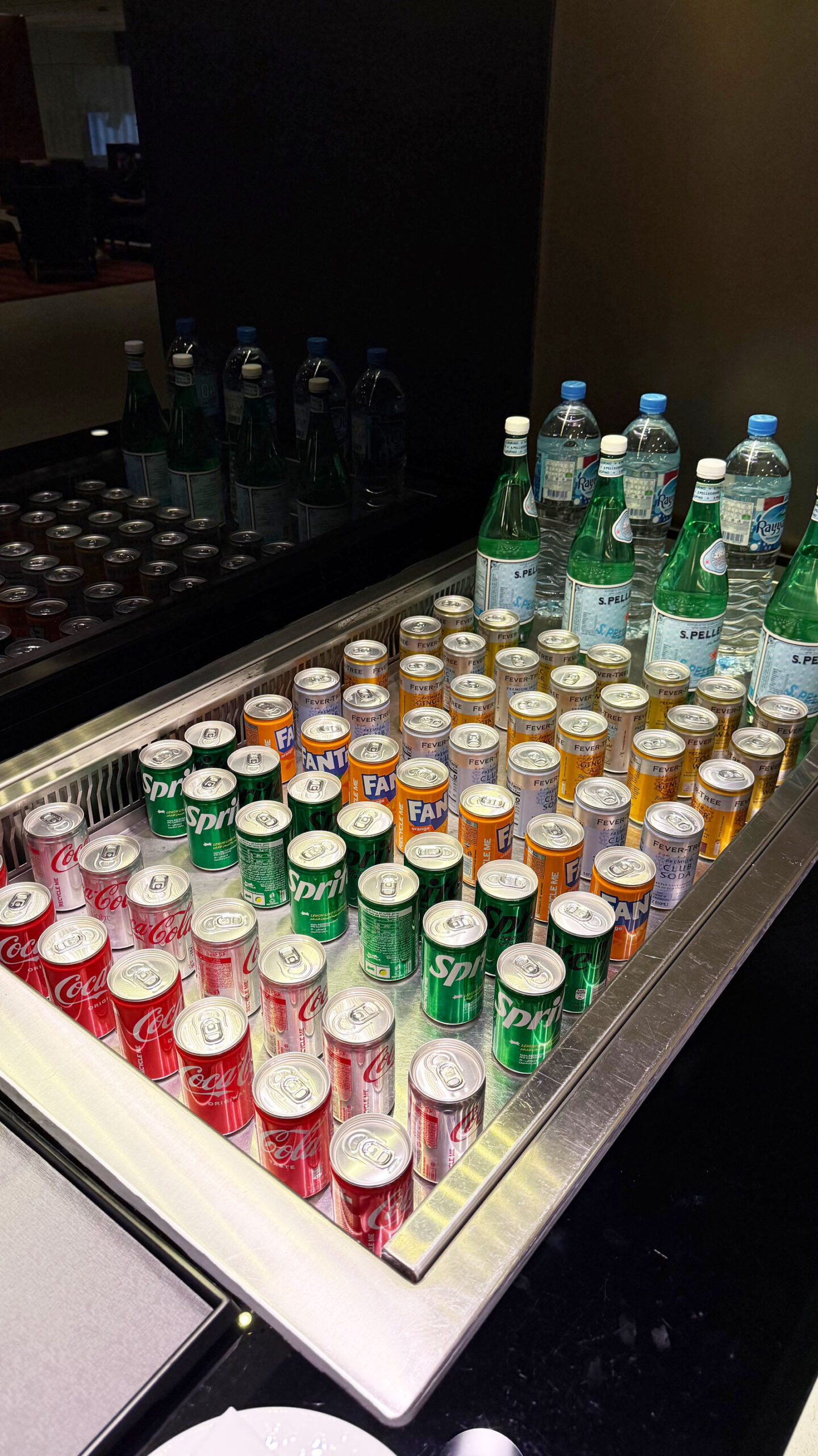A alimentação é simples, com snacks, além de bebidas não alcoólicas e uma máquina que prepara café ou chocolate quente na hora. Como é um lounge onde as pessoas não passam muito tempo não há opções mais elaboradas para comer e beber.
