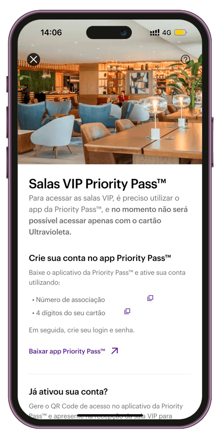 - Ative sua conta pelo site Priority Pass utilizando o número de associação e os 4 dígitos do cartão que aparecem na tela.