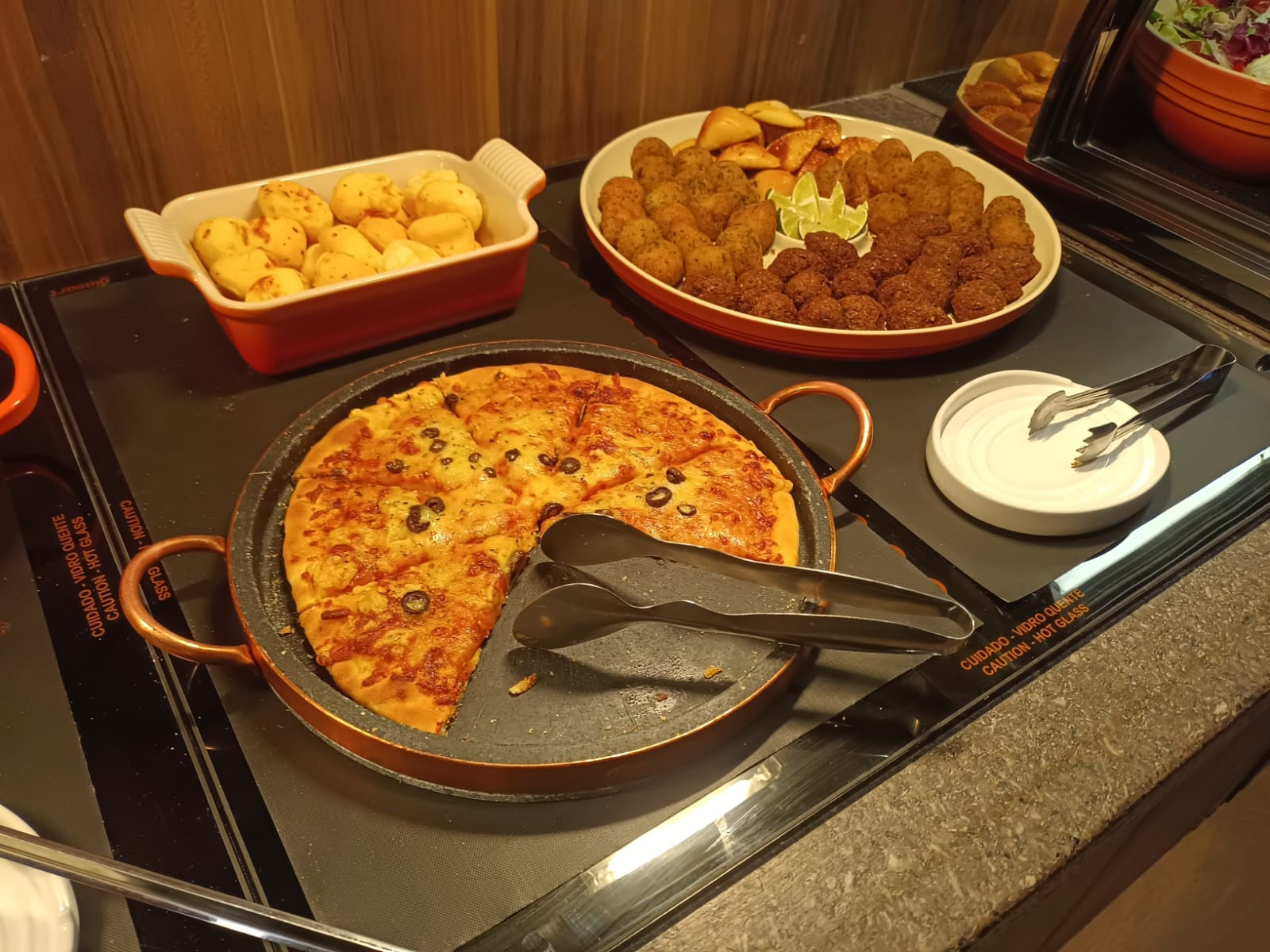 A salsicha com molho também era boa. A coxinha estava bem molhadinha e crocante. Já o pão de queijo não estava bom, estendo seco e borrachudo. A esfirra era seca. A pizza era regular, não sendo muito saborosa. O sushi não estava ruim, mas não espere muito. As mousses eram bastante boas, estavam bem geladas, e a de limão era particularmente saborosa.