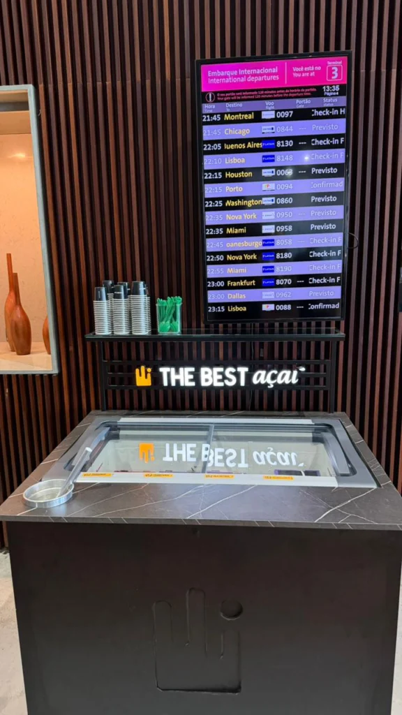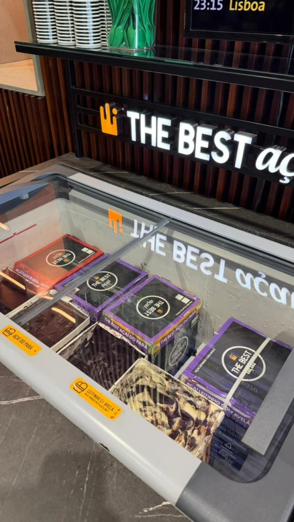 Agora, o espaço conta com freezers que oferecem diferentes sabores de açaí. Entre as opções disponíveis estão açaí tradicional do Pará, açaí com morango e açaí sabor leitinho com avelã.