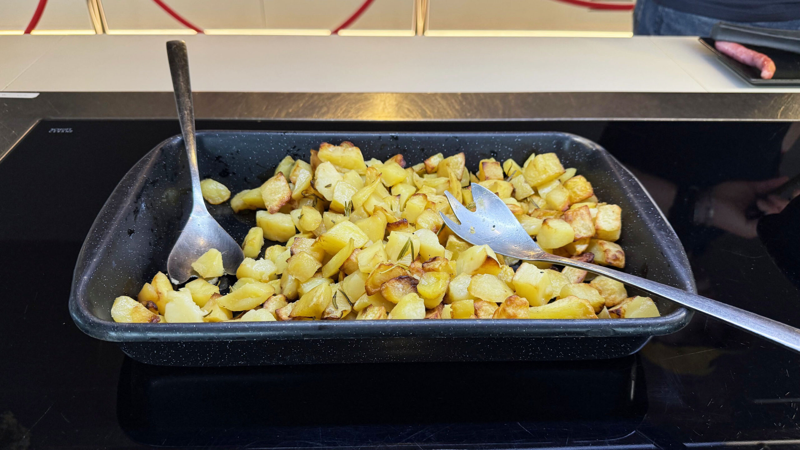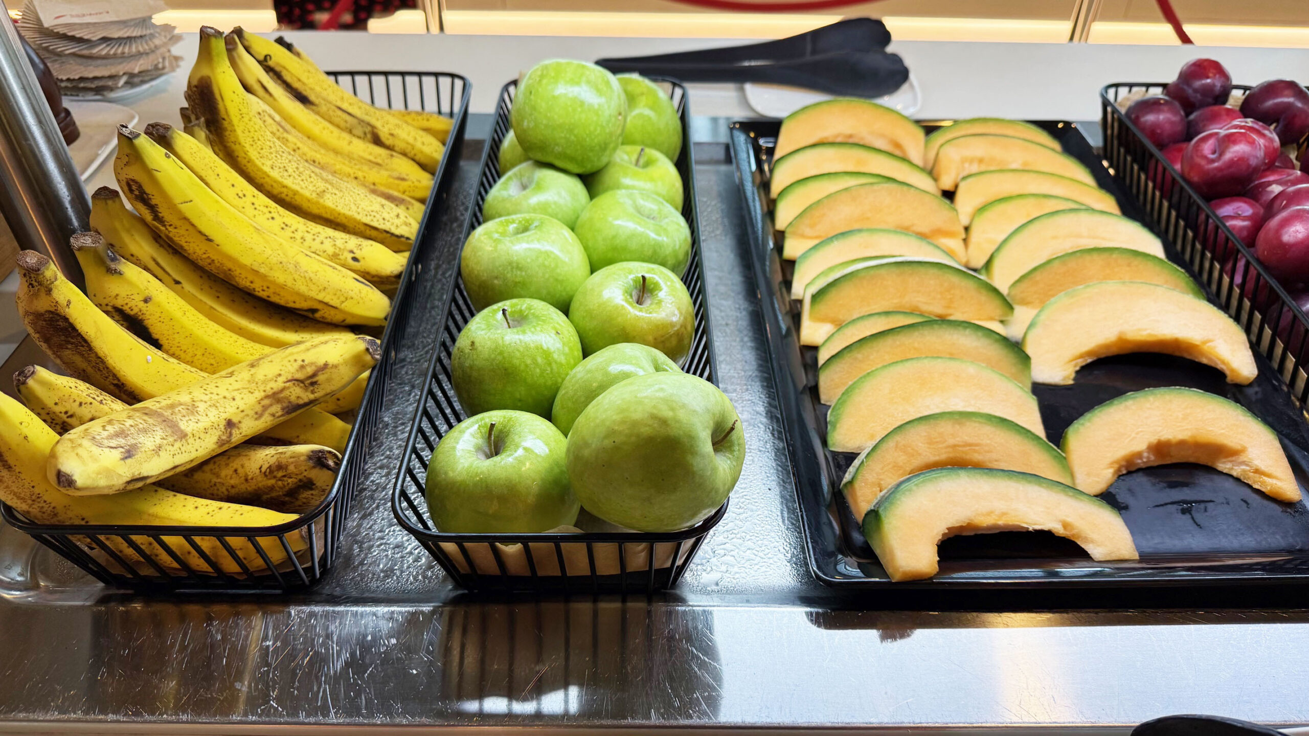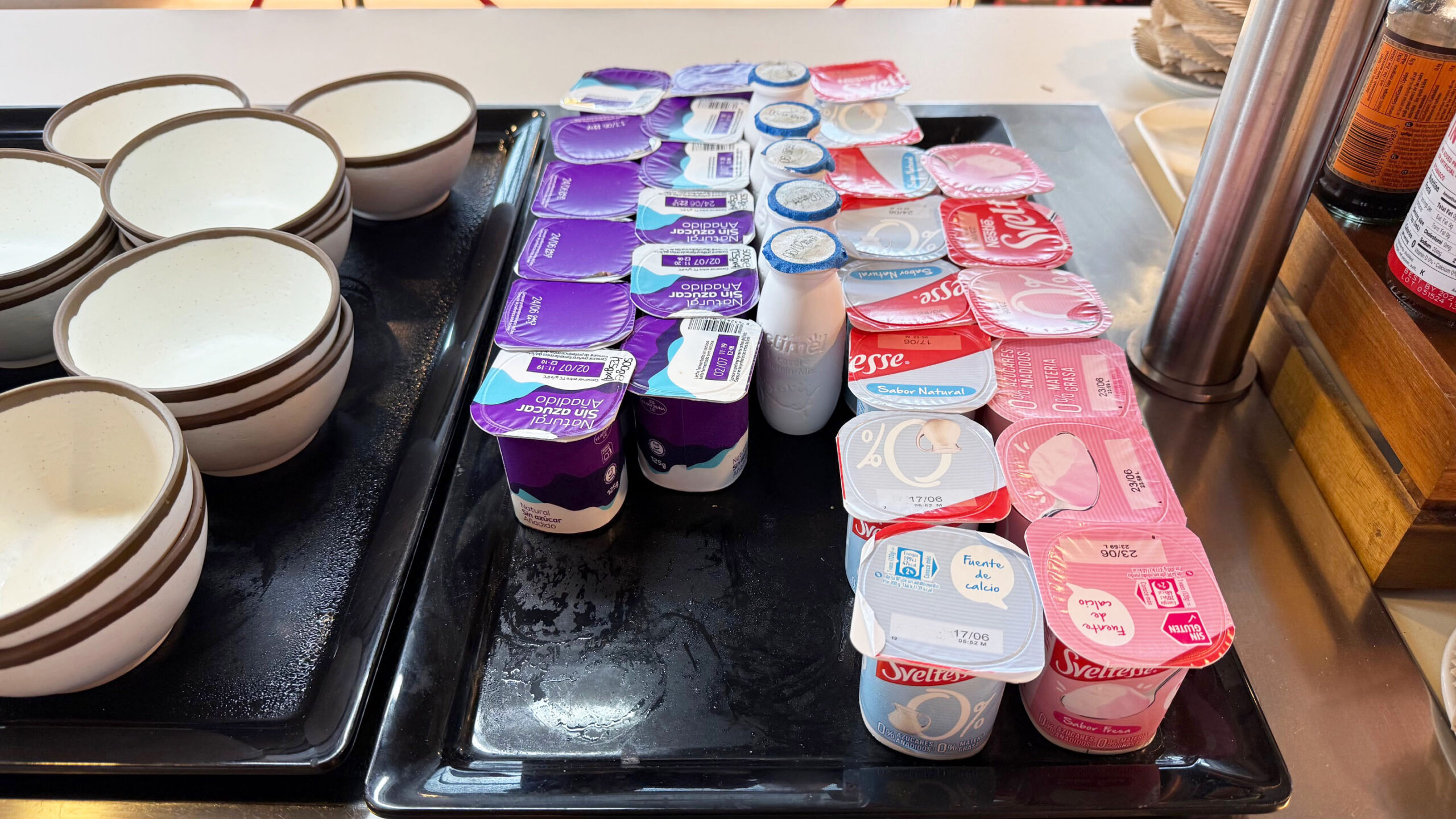 A alimentação é um dos pontos fortes desta sala VIP. Usei o espaço no café da manhã e encontrei muita variedade de pratos quentes e frios, além de frutas, iogurtes e até mesmo um cantinho para as crianças cheio de guloseimas.