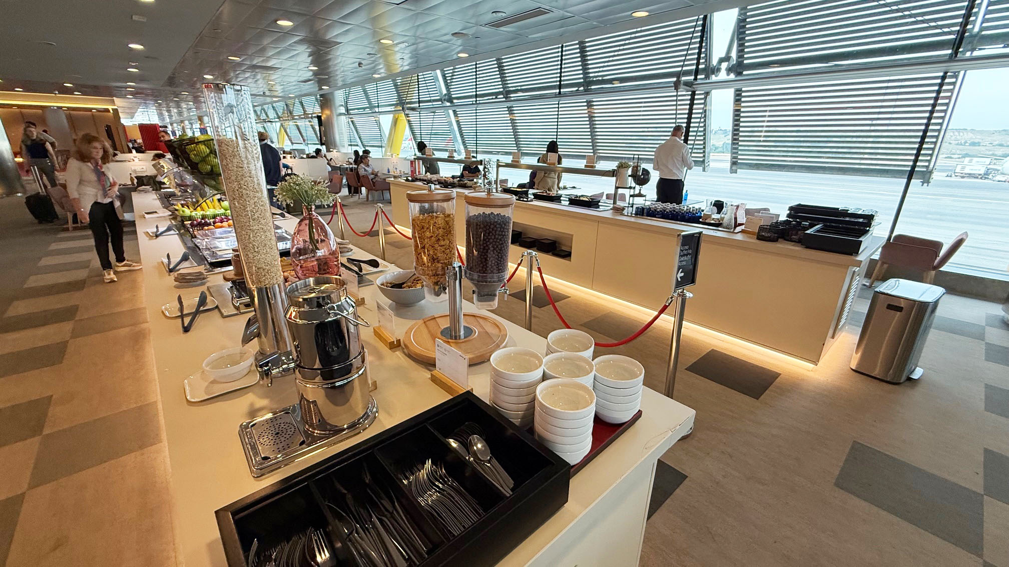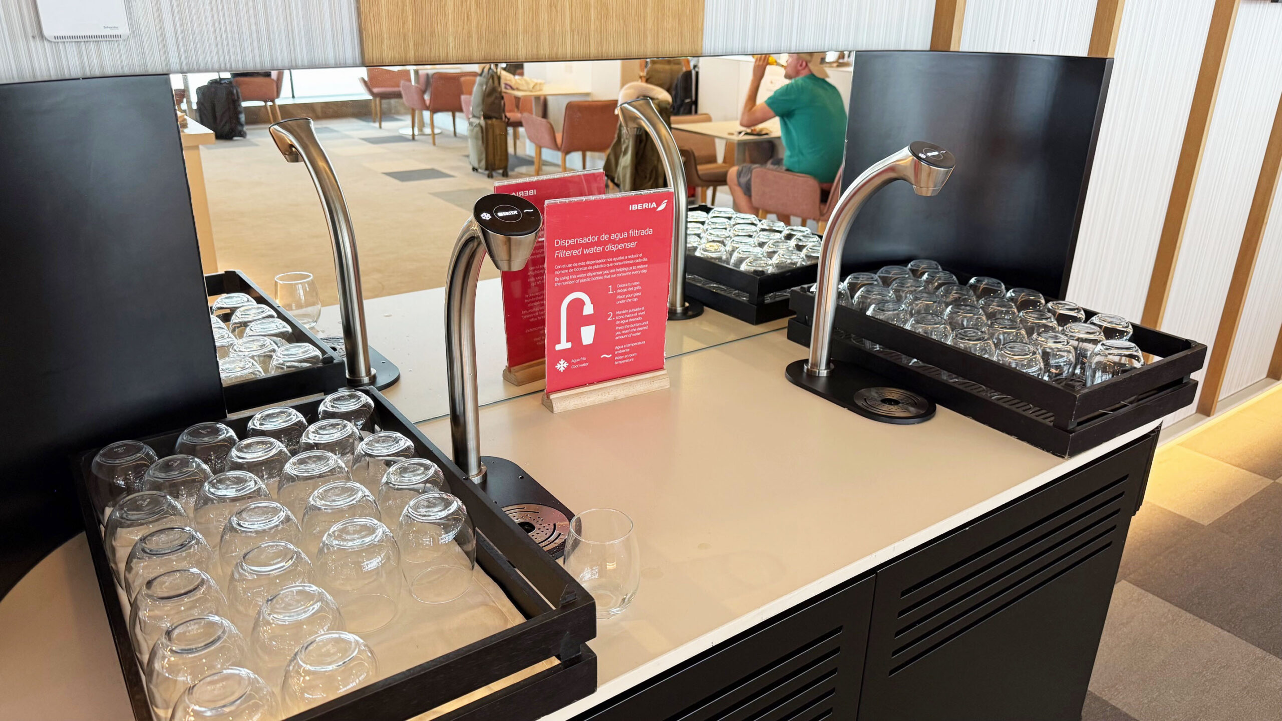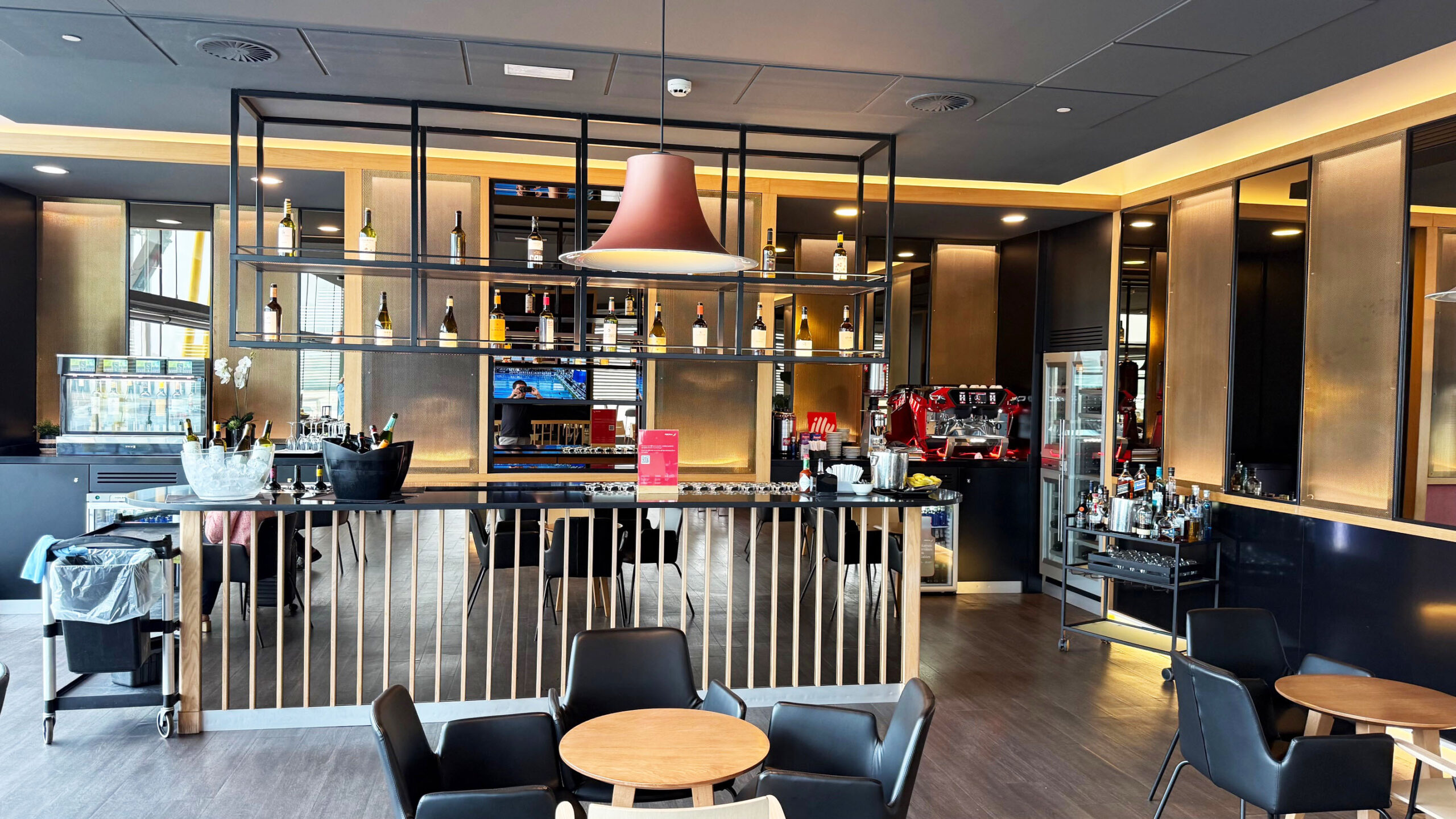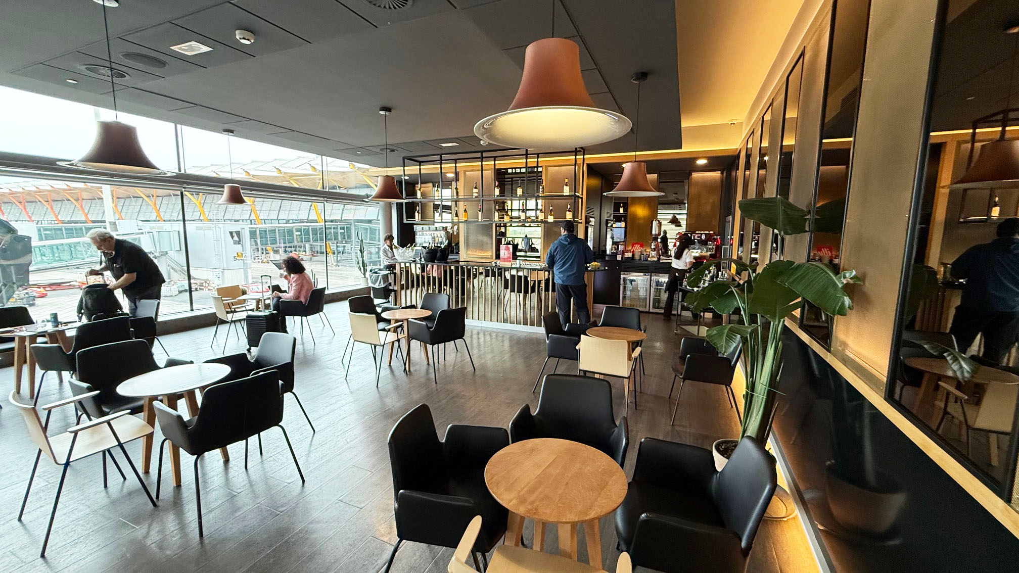 O Iberia Premium Lounge Velázquez oferece um ambiente amplo, moderno e com design sofisticado, que me agradou assim que entrei. O espaço é bem iluminado, com grandes janelas de vidro que permitem vista direta para o pátio de aeronaves, criando uma atmosfera agradável e arejada. A decoração segue um estilo contemporâneo, com móveis de linhas retas, poltronas confortáveis distribuídas em diferentes áreas e pontos de recarga para dispositivos eletrônicos espalhados por todo o lounge.