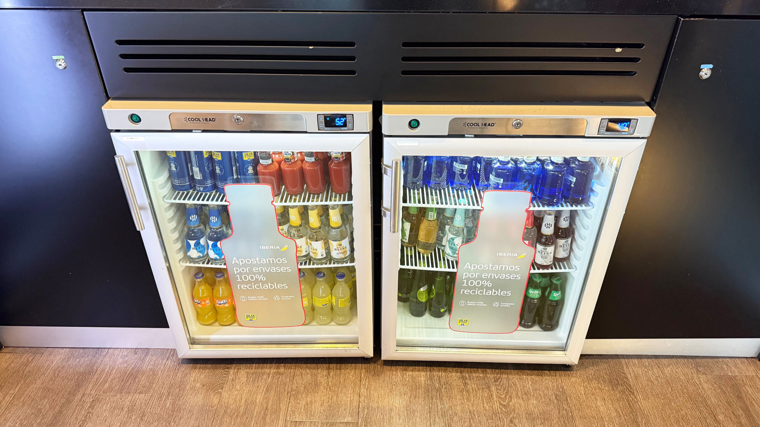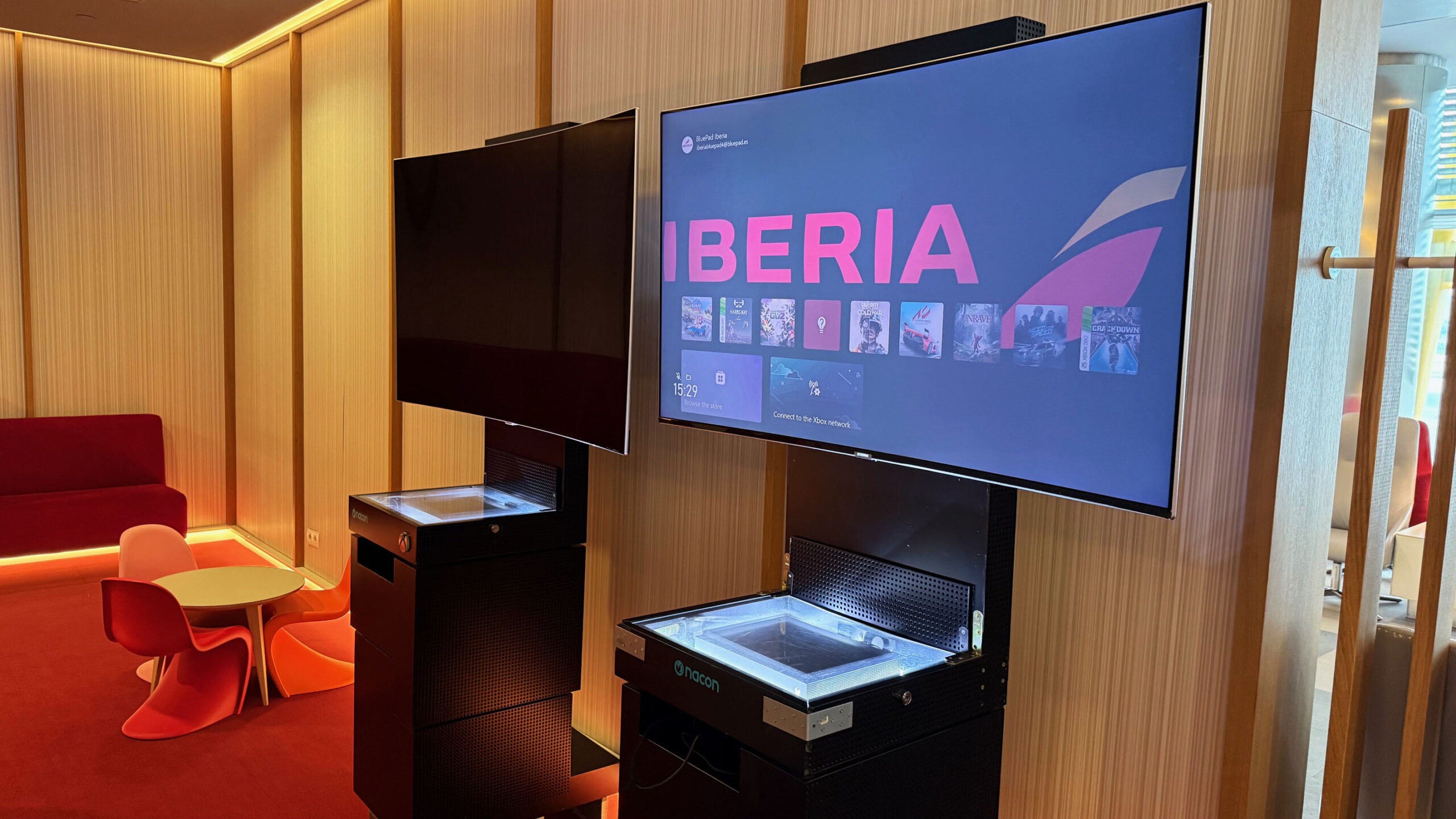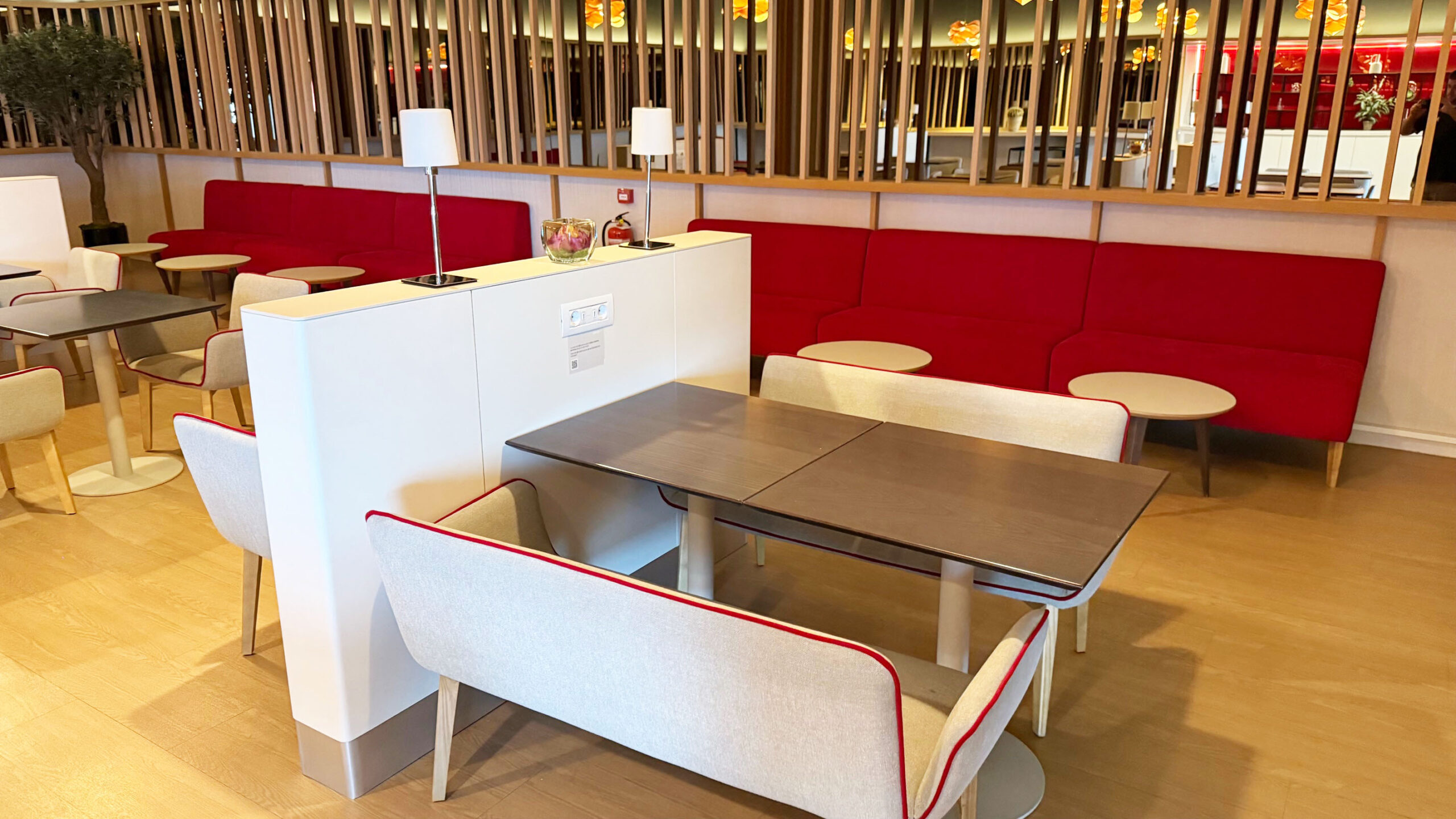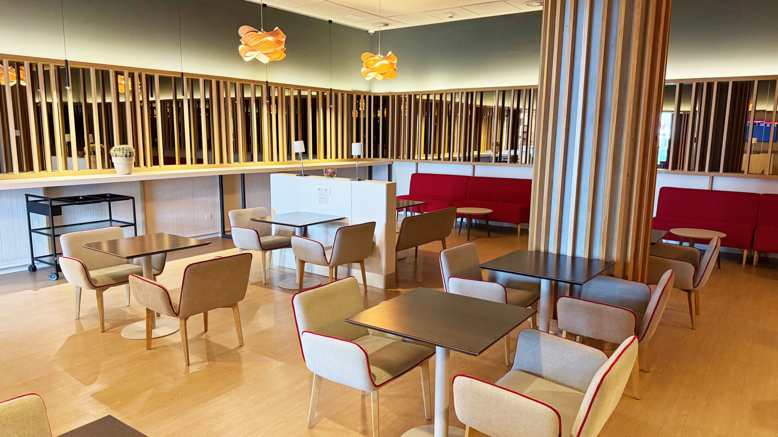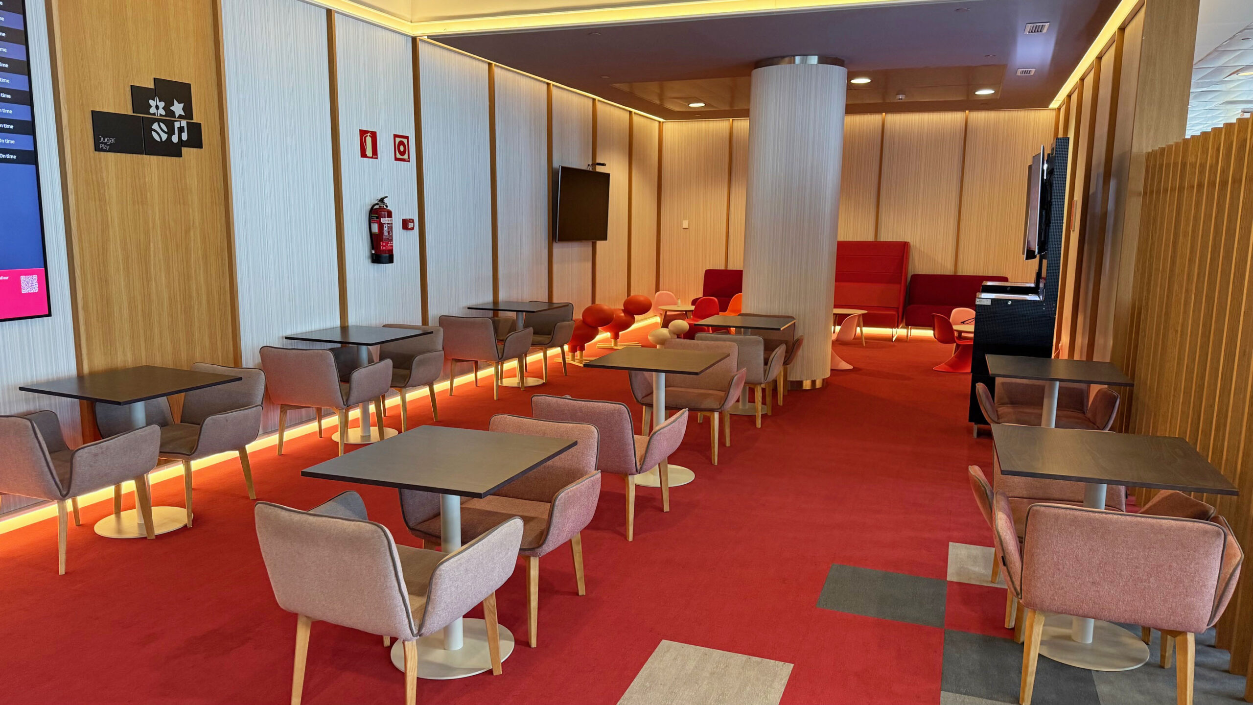 O Iberia Premium Lounge Velázquez oferece um ambiente amplo, moderno e com design sofisticado, que me agradou assim que entrei. O espaço é bem iluminado, com grandes janelas de vidro que permitem vista direta para o pátio de aeronaves, criando uma atmosfera agradável e arejada. A decoração segue um estilo contemporâneo, com móveis de linhas retas, poltronas confortáveis distribuídas em diferentes áreas e pontos de recarga para dispositivos eletrônicos espalhados por todo o lounge.