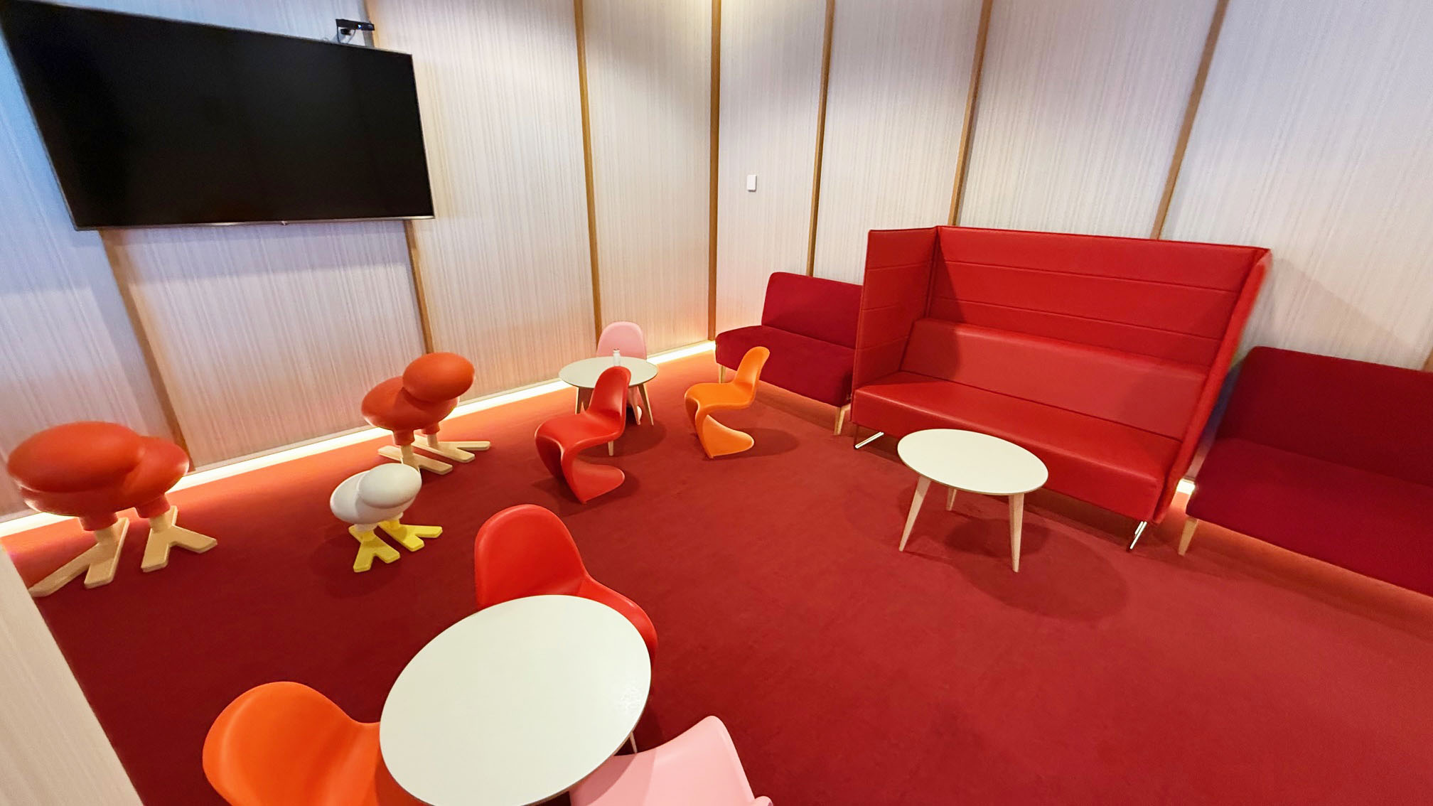 A área de videogames e kids club – com vários assentos próximos para os pais: