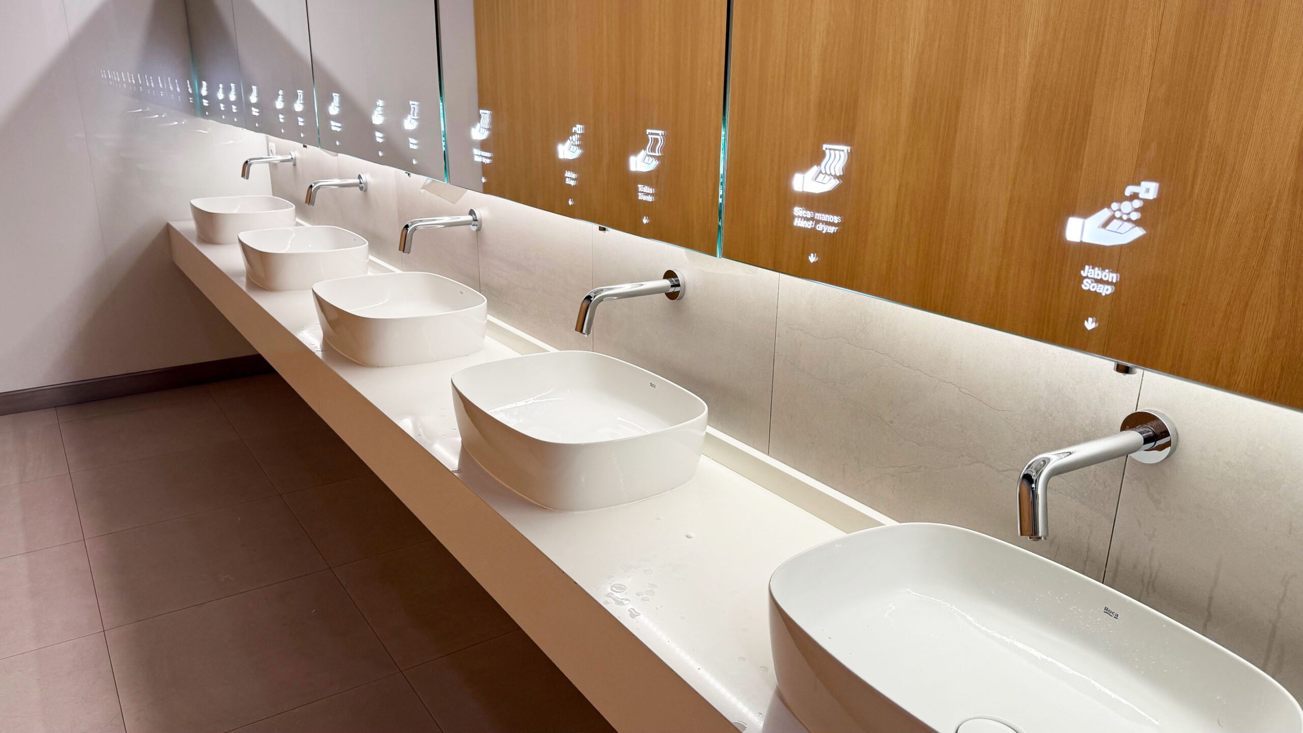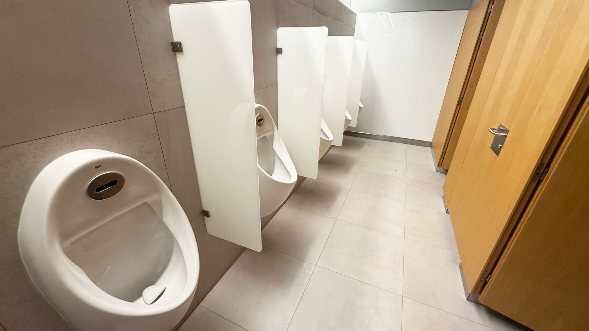 Os banheiros são ótimos, modernos e confortáveis, além de limpos e cheirosos. Neste lounge, há salas de banho individuais, que são ótimas para tomar um banho antes do voo.