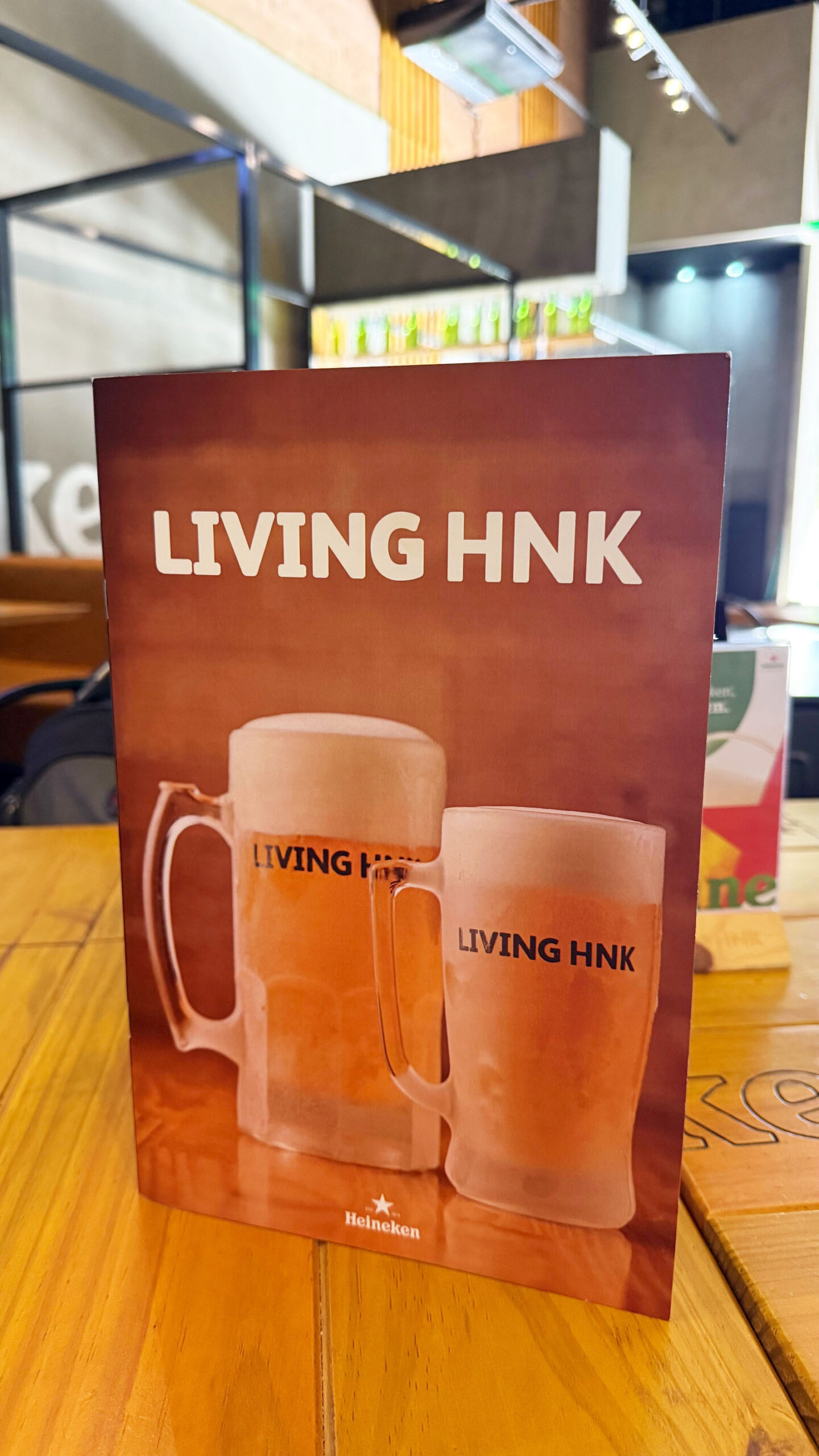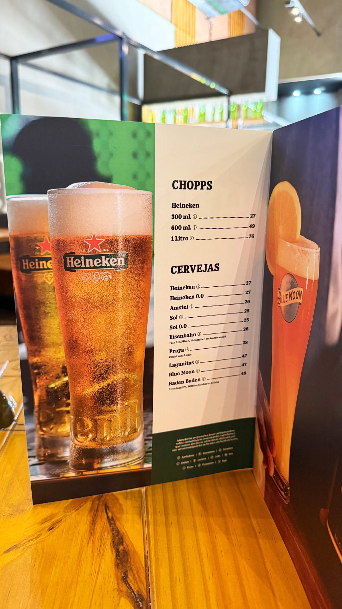 O ambiente do restaurante tem um visual moderno e vibrante, com forte presença da marca Heineken na decoração, o que cria um clima despojado e jovem. As luzes verdes, os painéis iluminados e os grandes murais temáticos trazem uma pegada urbana e sofisticada. O espaço é amplo, bem iluminado e conta com diferentes tipos de assentos, desde mesas mais tradicionais até sofás confortáveis, ideal tanto para um happy hour quanto para um encontro mais descontraído.