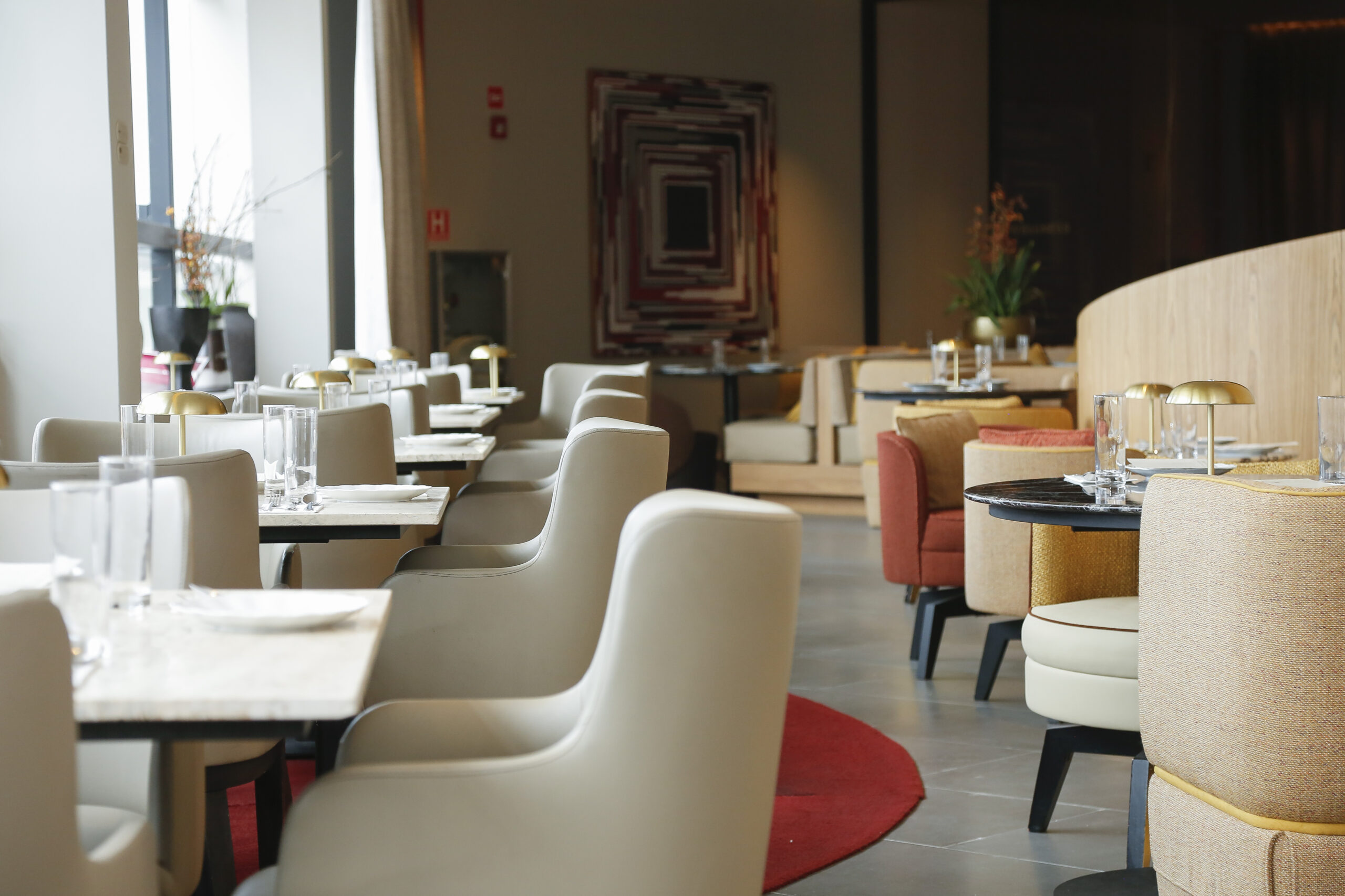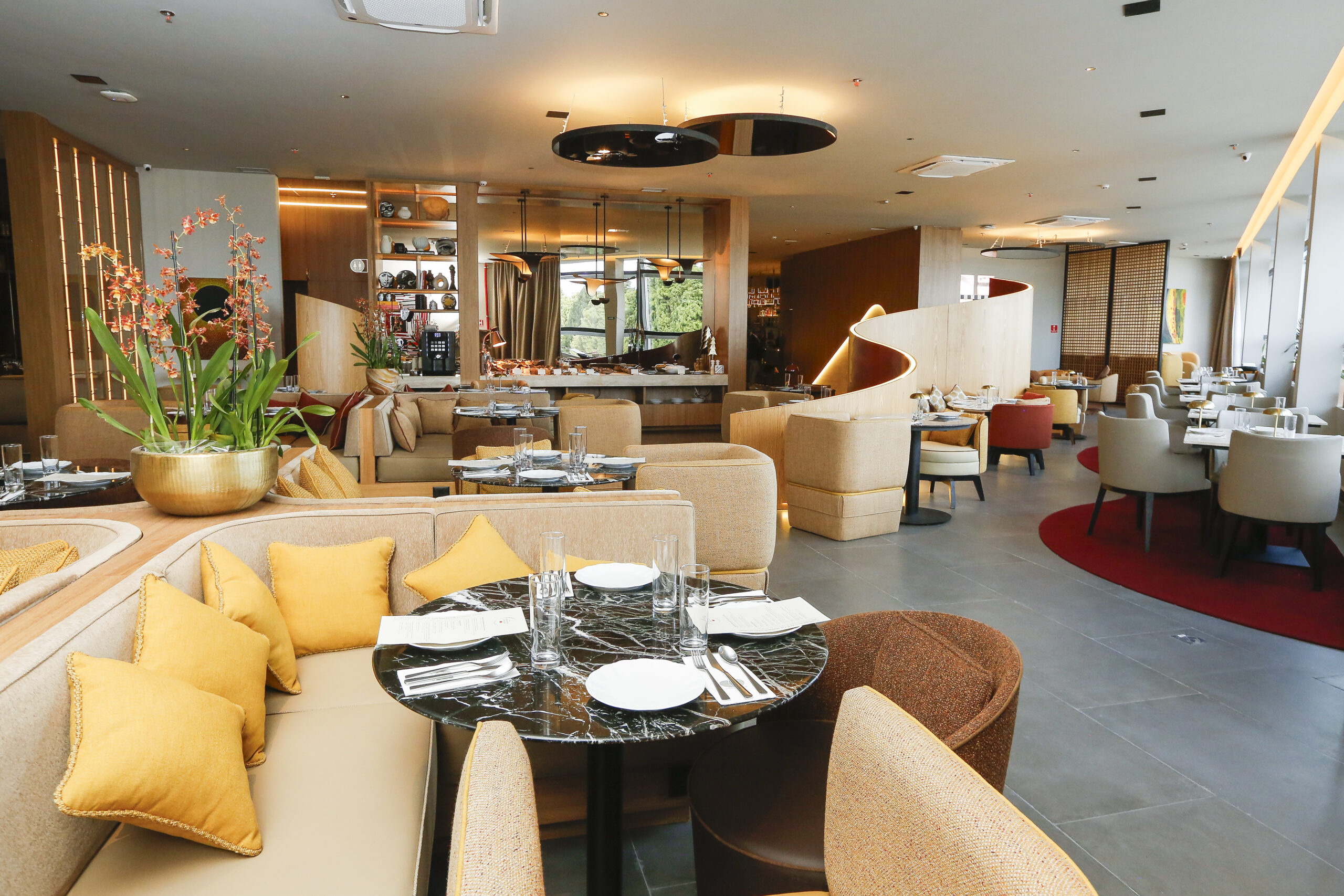 O lounge funciona das 10h às 23h30, oferecendo café da manhã, buffet e serviço à la carte.