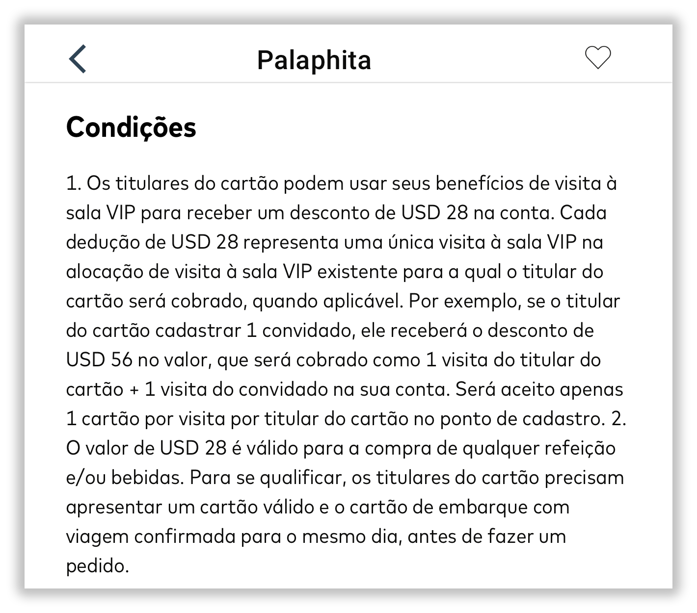 Abaixo, é possível ver uma captura de tela do aplicativo LoungeKey, que mostra as condições de acesso ao Palaphita e a menção ao crédito de US$28 disponível para utilização no local.