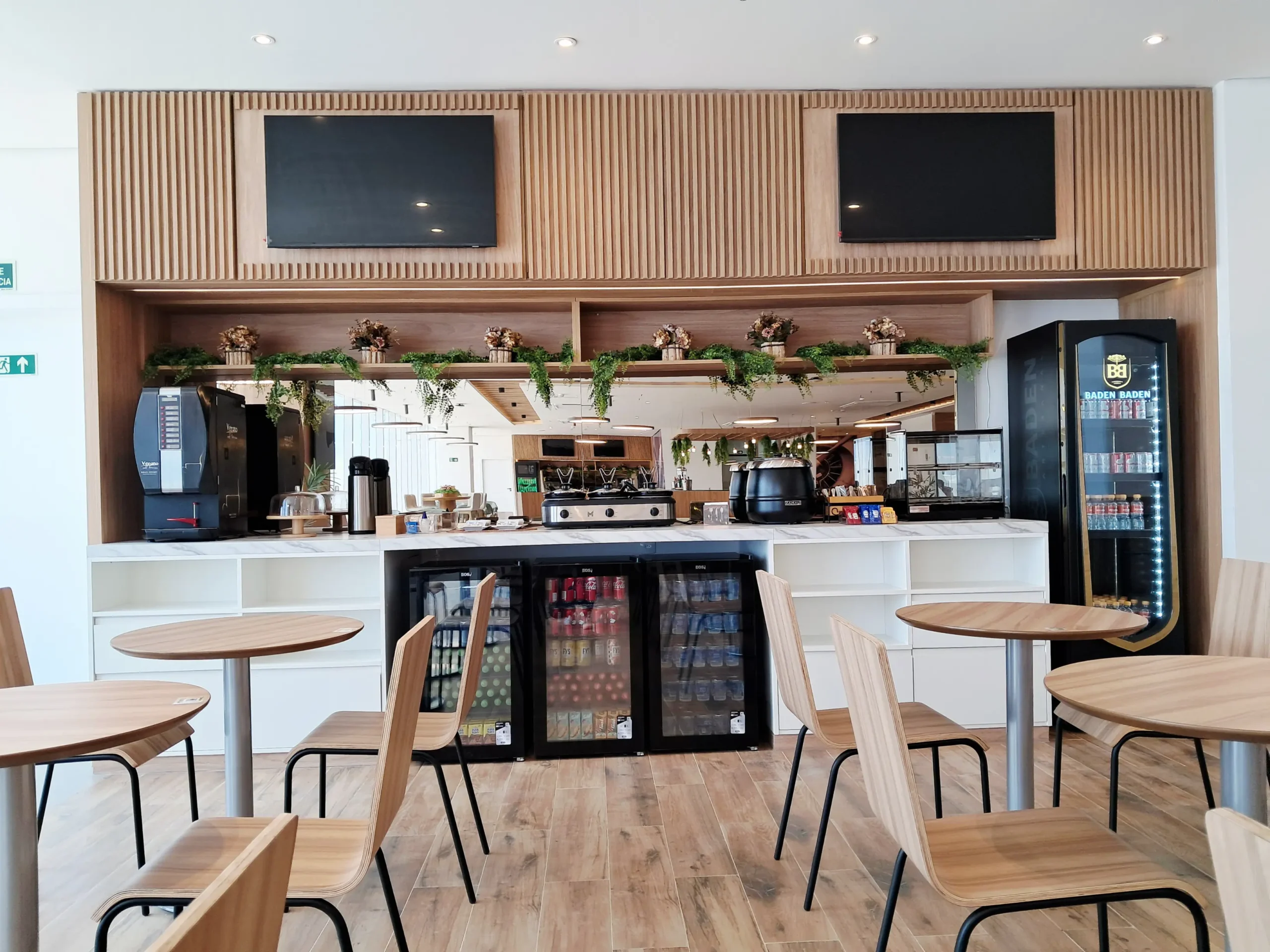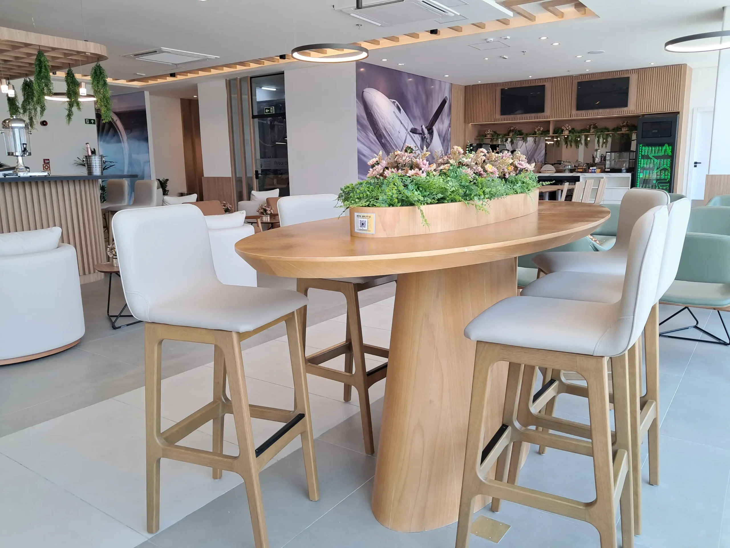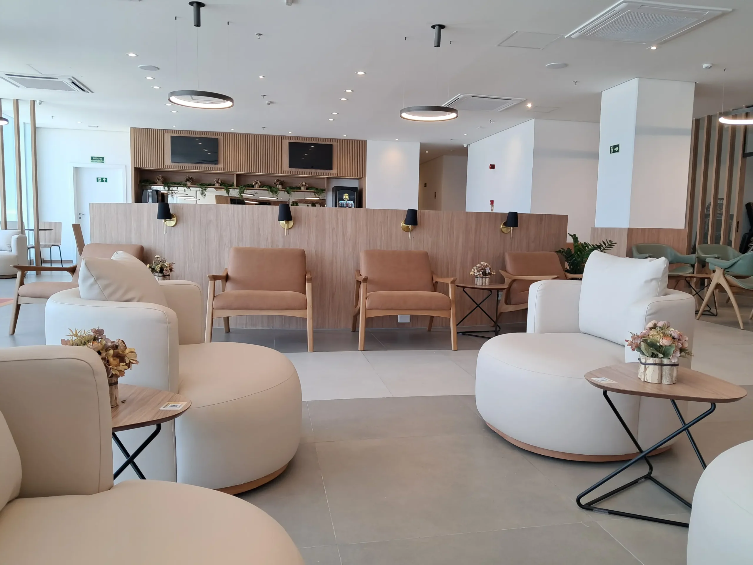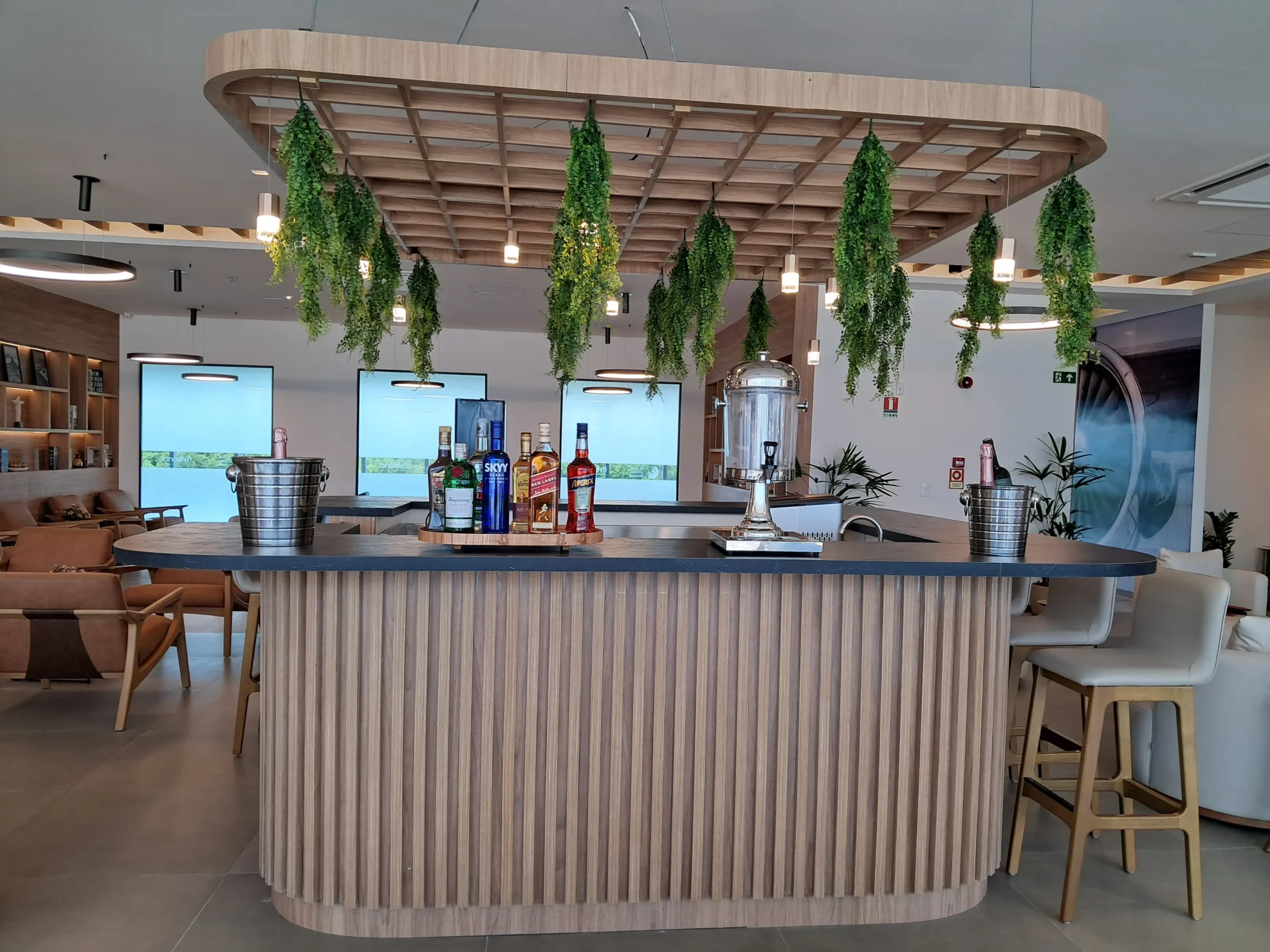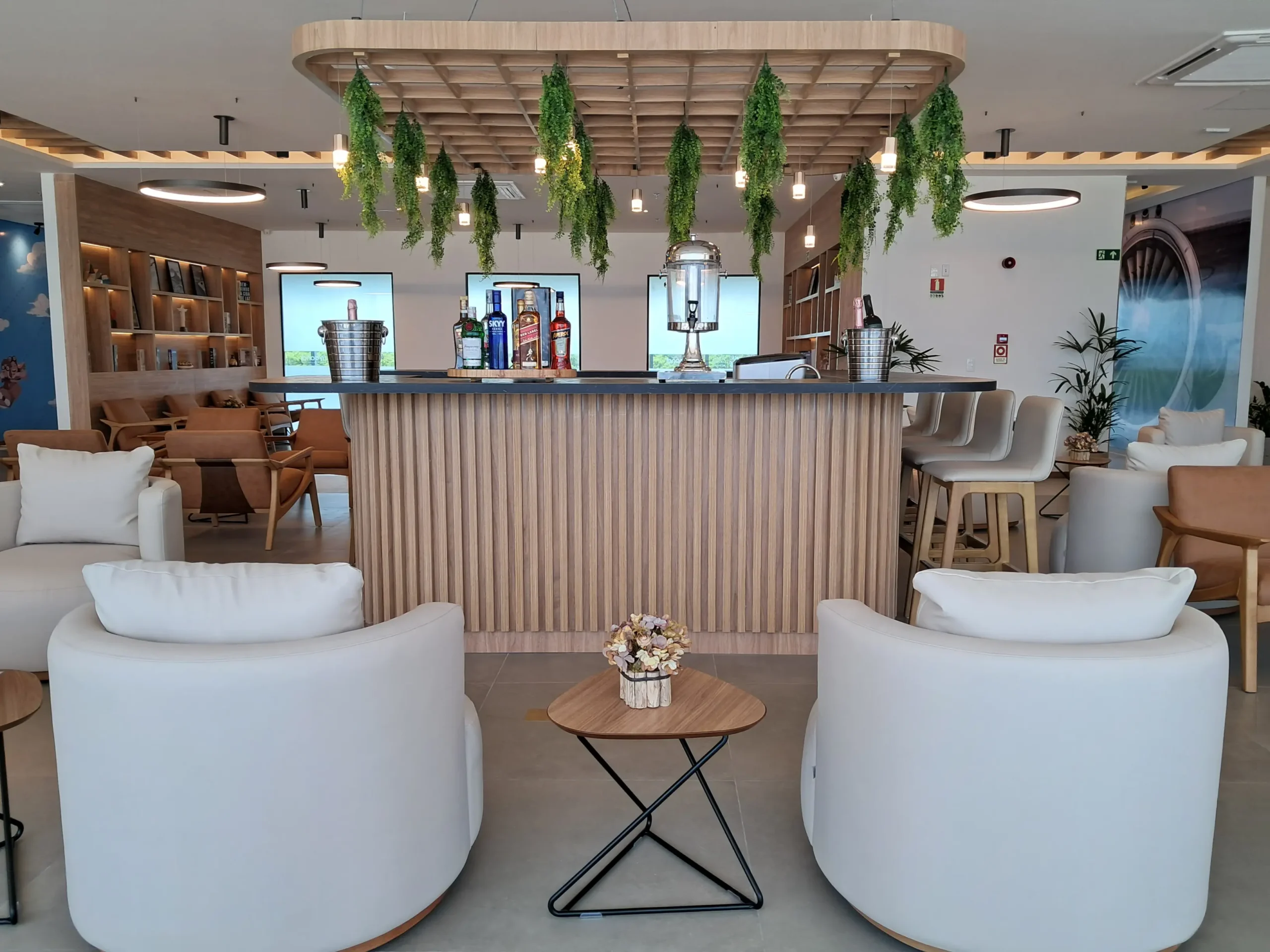 A sala VIP Flybondi by Global Lounge Network tem mais de 600m² e foi pensada para quem quer conforto e boas opções de alimentos e bebidas. Para mim, é a sala mais bonita da Global Lounge Network no Brasil.