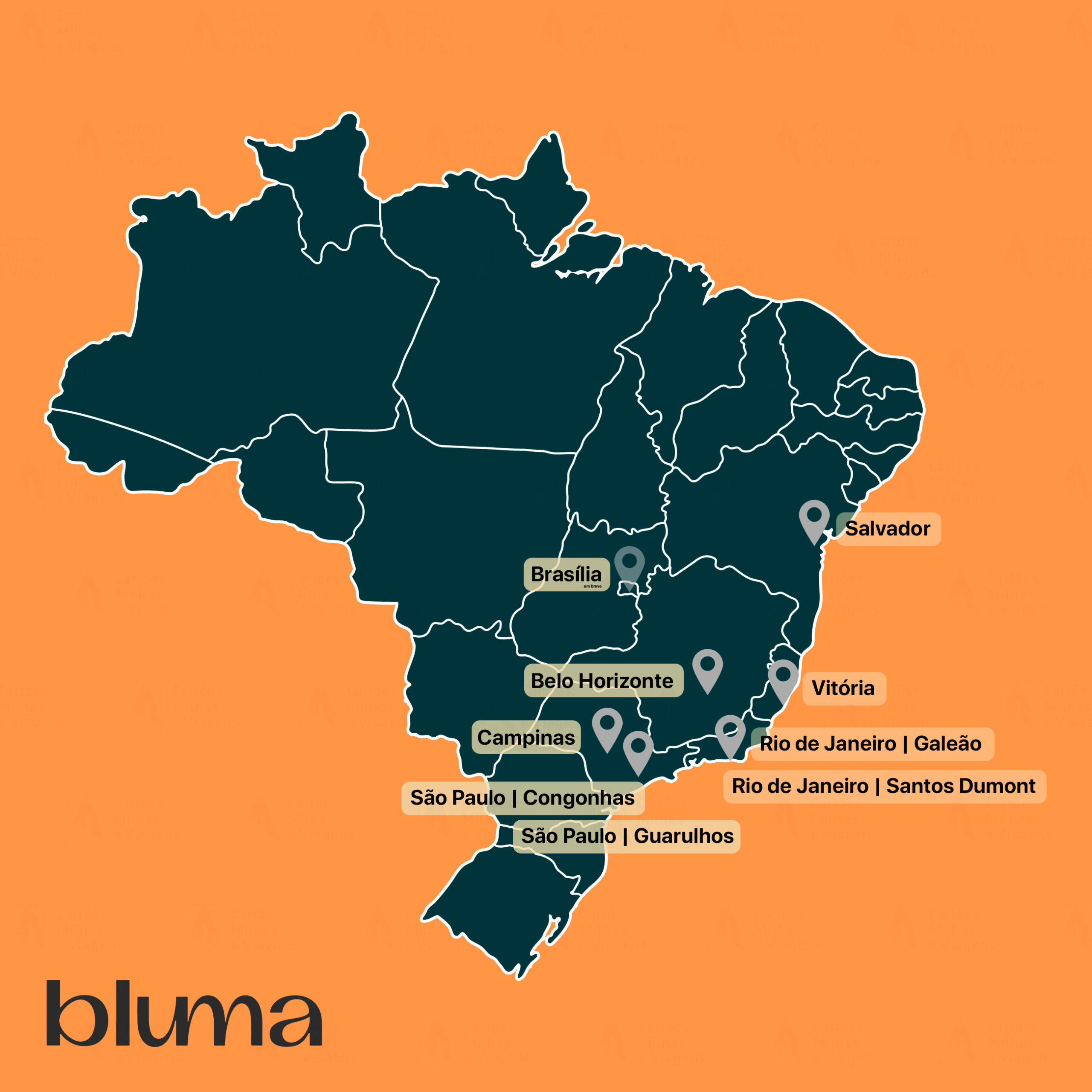 A seguir, é possível conferir os serviços oferecidos em cada unidade da Bluma, bem como sua localização nos aeroportos e as formas de acesso disponíveis para os passageiros.