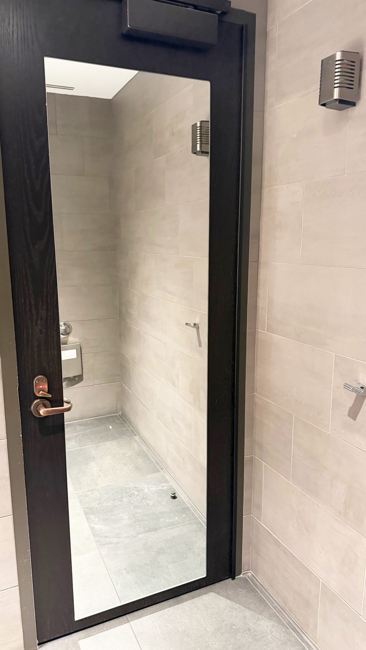 Os banheiros são ótimos, modernos e confortáveis, além de limpos e cheirosos. Neste lounge, há salas de banho individuais, que são ótimas para tomar um banho antes do voo.