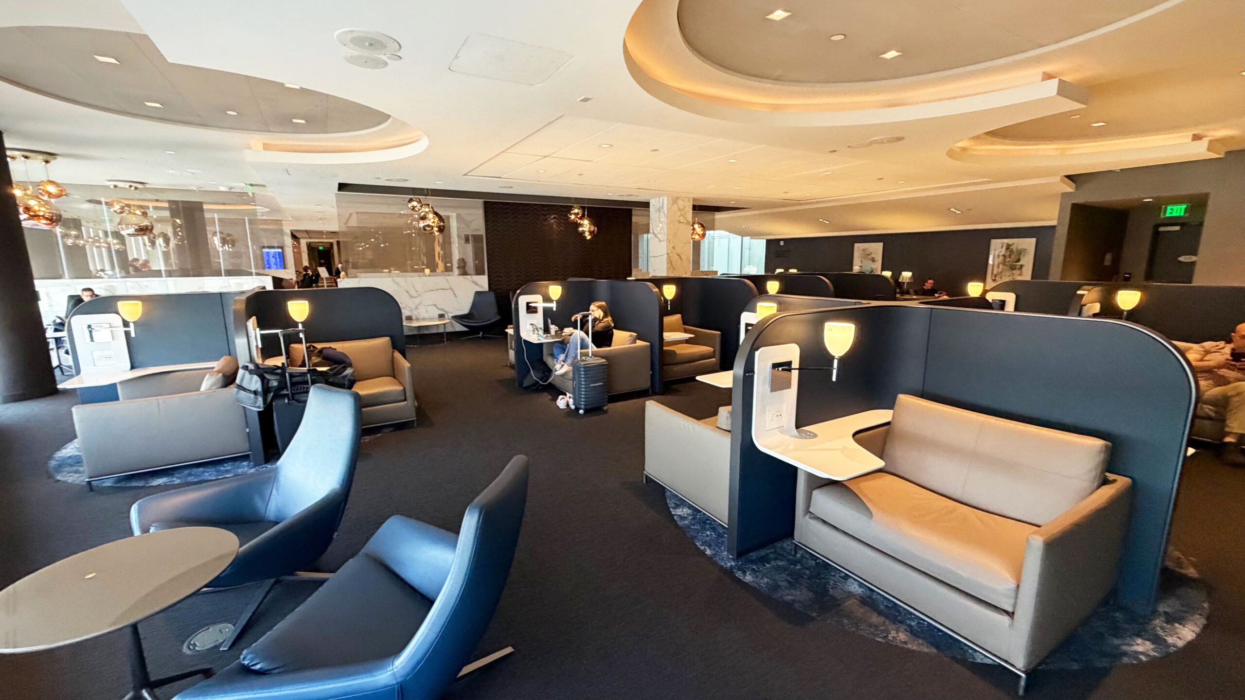 O United Polaris Lounge de Houston reflete o padrão mais alto da companhia aérea. O espaço combina design sofisticado e funcionalidade em um ambiente silencioso e bem distribuído. As cabines individuais com tomadas, iluminação própria e poltronas amplas criam um ambiente ideal para quem busca conforto e privacidade antes de um voo internacional na Classe Executiva Polaris.