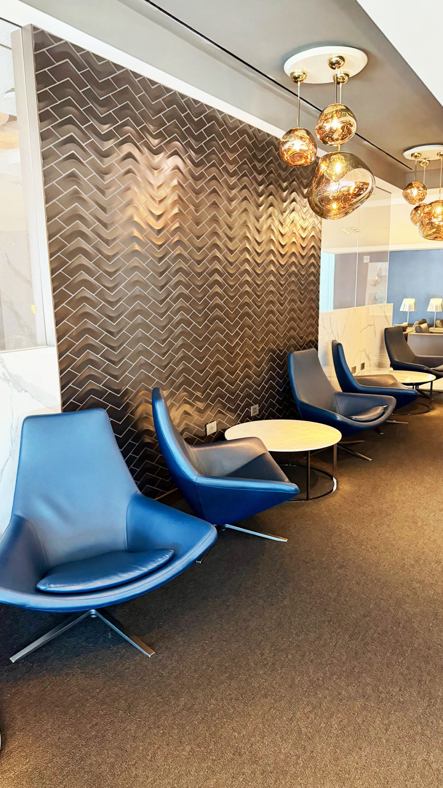 Visualmente, o lounge impressiona pela combinação de mármore, tons de azul e iluminação dourada – um contraste elegante que reforça o ar contemporâneo do espaço. A sensação é de exclusividade: nada é exagerado, mas tudo é pensado para entregar uma experiência de alto nível.